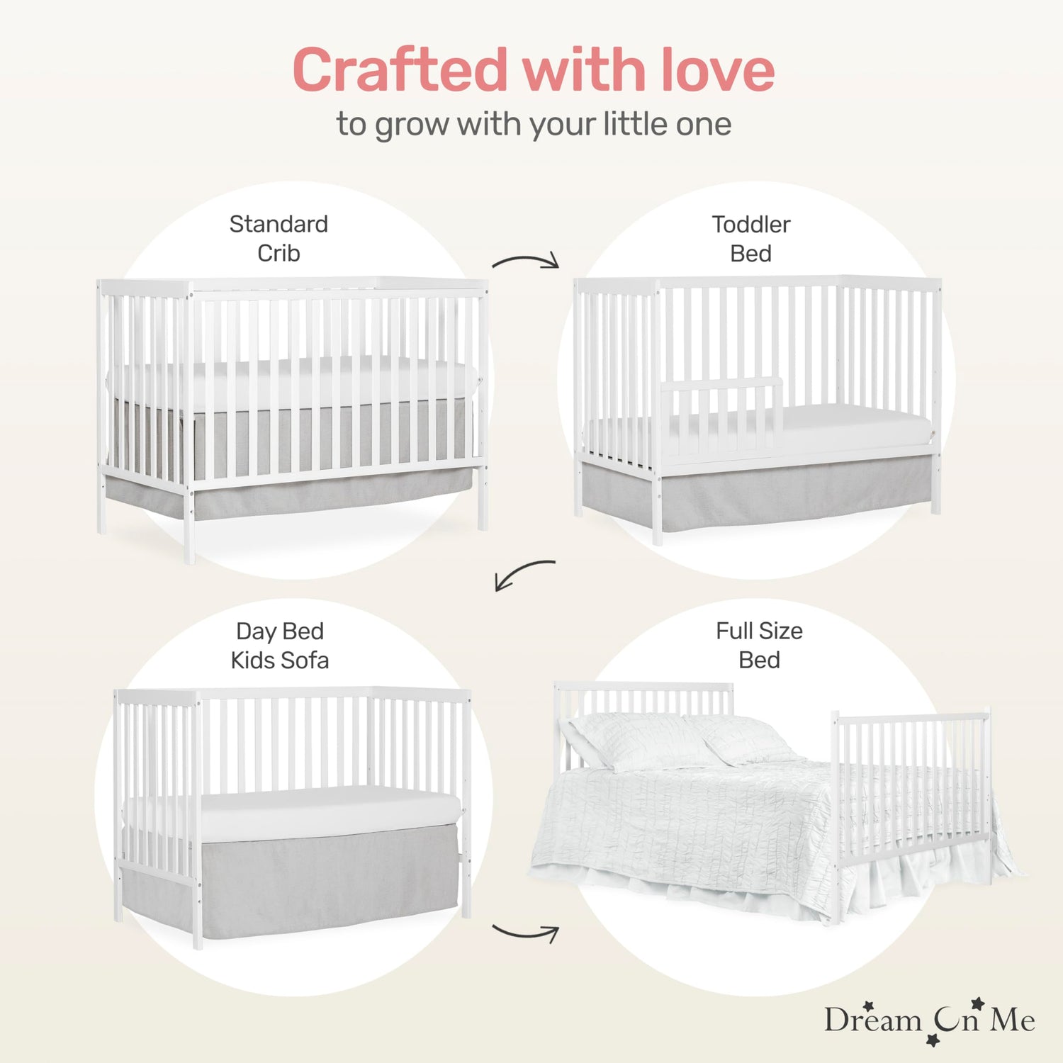 Details: The Dream On Me Synergy 5-in-1 Convertible Crib is the perfect blend of style and substance, bringing together contemporary design with abundant features and a focus on safety. This gender-neutral crib grows with your child! It converts from a crib to toddler bed, toddler bed rail sold separately) a daybed and full-size bed (full-size bed frame and mattress not included). It also comes with a 3-position adjustable mattress support system. Safety and durability are never a concern with the Synergy Convertible Crib. It is built to last, made out of solid reclaimed New Zealand pinewood. All Dream On Me cribs is JPMA certified and meet all applicable ASTM and CPSC standards. All of our products are tested by third-party labs for lead and other toxic elements to meet or exceed CPSC and ASTM safety standards. The Synergy comes in beautiful, non-toxic finishes that allow you to create the nursery of your dreams - contemporary, whimsical, fairy, vintage - let your imagination reign supreme! This is a standard full-size crib and measures 53.0" L x 29.0" W x 39.0" H inches. For the best fit, we recommend any Dream On Me or Evolur full-size, non-toxic, Greenguard certified mattress.