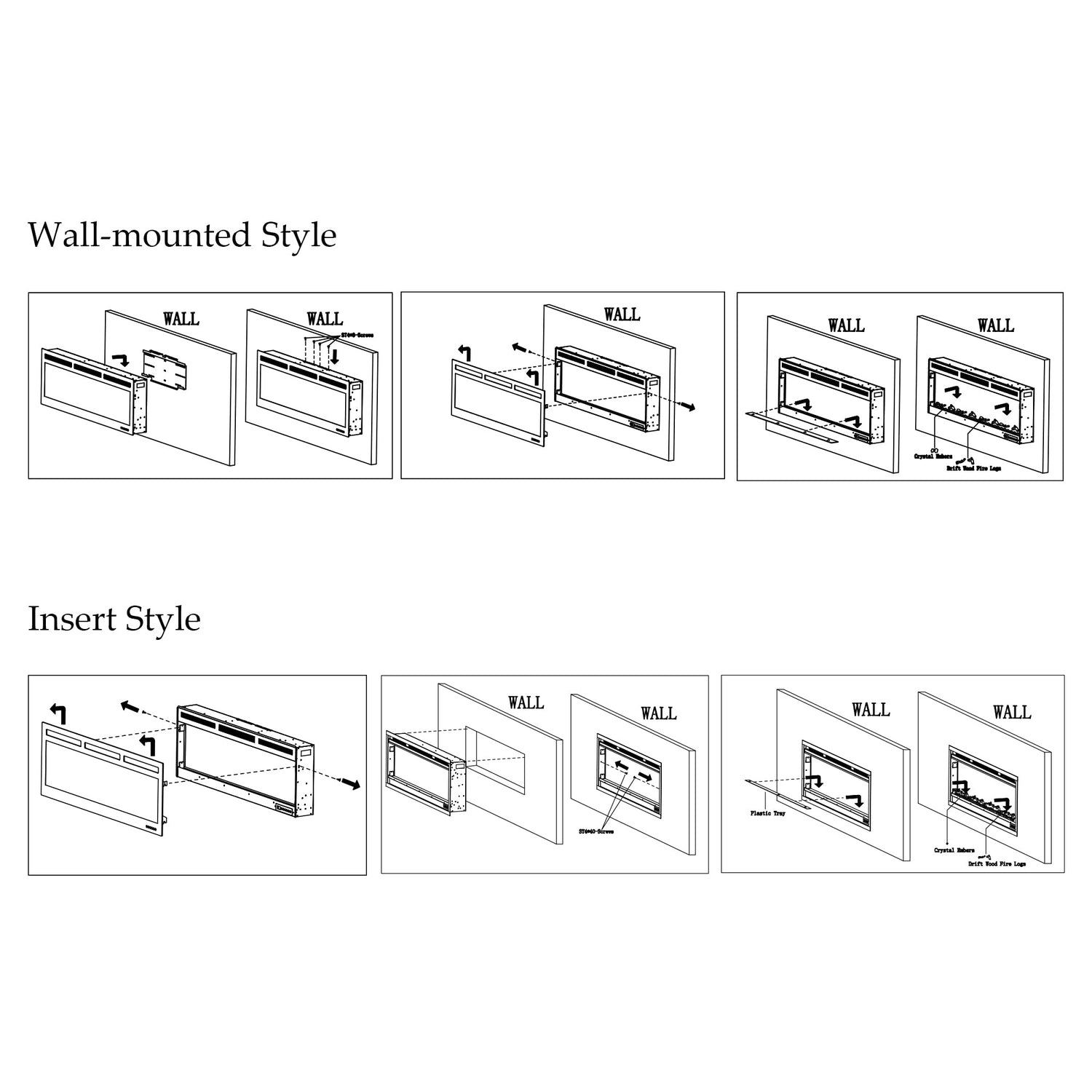 - Easy Installation: Recessed in wall or Wall-mounted on the wall, both could be chosen as requirements. No much assembly is required when installing this fireplace, almost two adults could complete it in a short time. Details information on the User's Manual.