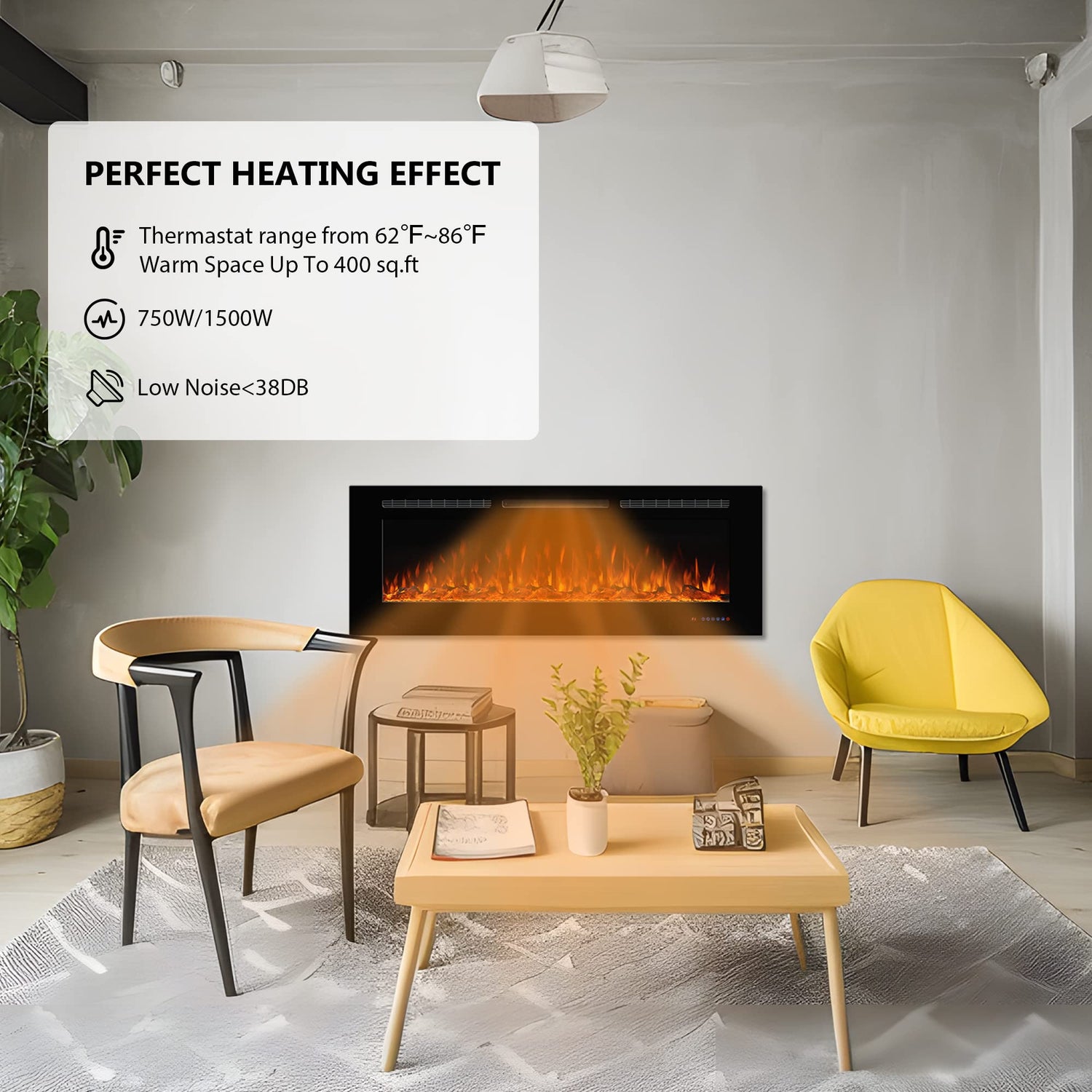 - [Heat Effect & Energy Saving] Fast heating and two power 750W/1500W(5100BTU). The electric wall fireplace is suitable for a space up to 400 sq ft. The temperature could be set with 15 gears from 62°F-86°F.