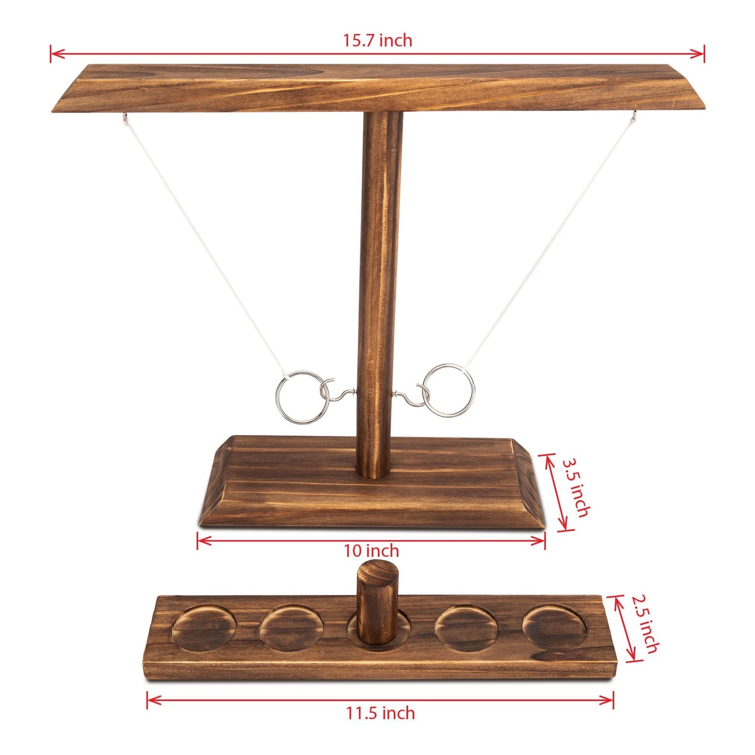 - FUN GAME: Place wooden cup in the center circle, Take rings and go! Each time you land the hook, move the wooden cup 1 space towards your opponent. Player wins when the wooden cup moves off the end of the ladder. Play every game Style by agreeing on a wager with your competitor before the game.