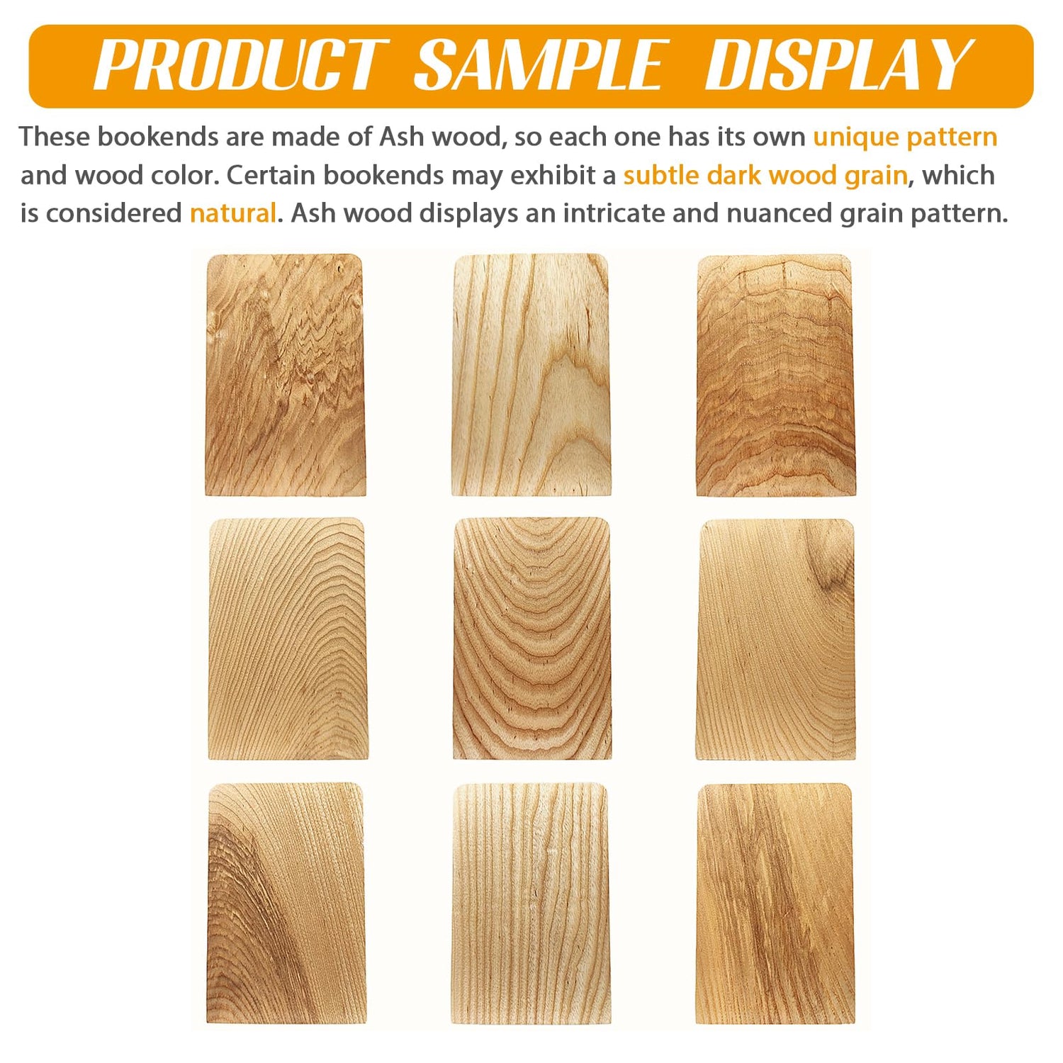 - PREMIUM MATERIAL: The book stoppers are made of Ash wood, so each one has a unique natural wood grain. Modern and classic in appearance, it is suitable for all occasions. The metal plate and screw parts are made of stainless steel, which is very suitable for long-term use in the bookshelf.