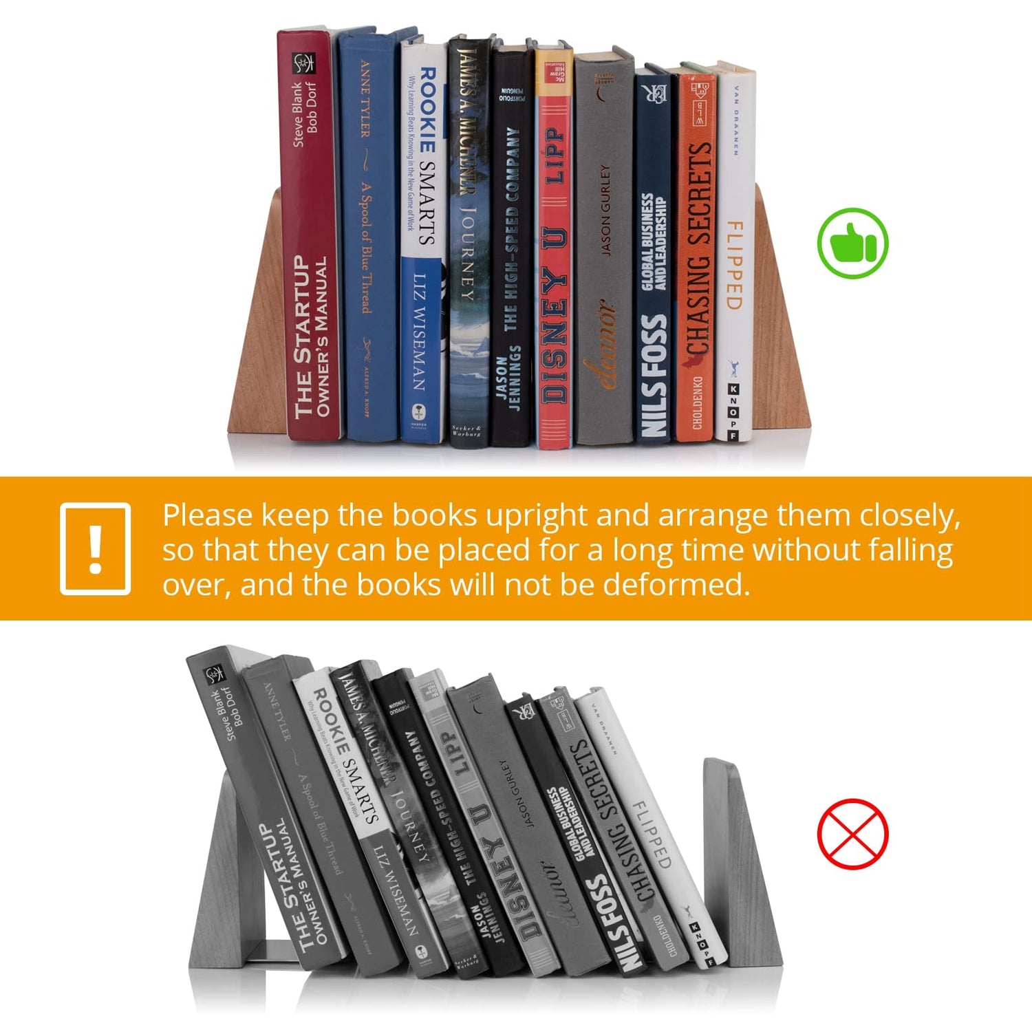 - PREMIUM MATERIAL: The book stoppers are made of Okoume wood, so each one has a unique natural wood grain. Modern and classic in appearance, it is suitable for all occasions. The metal plate and screw parts are made of stainless steel, which is very suitable for long-term use in the bookshelf.