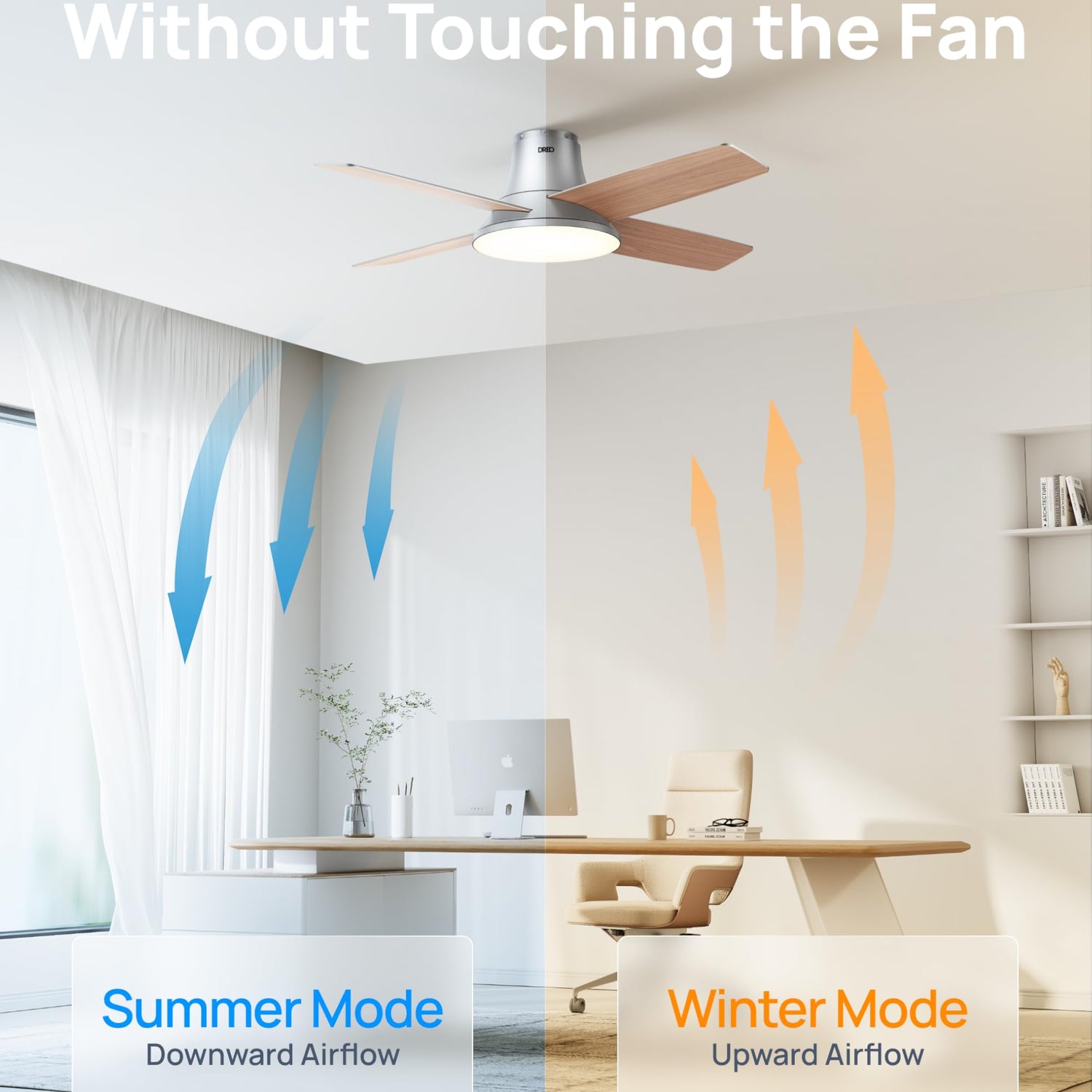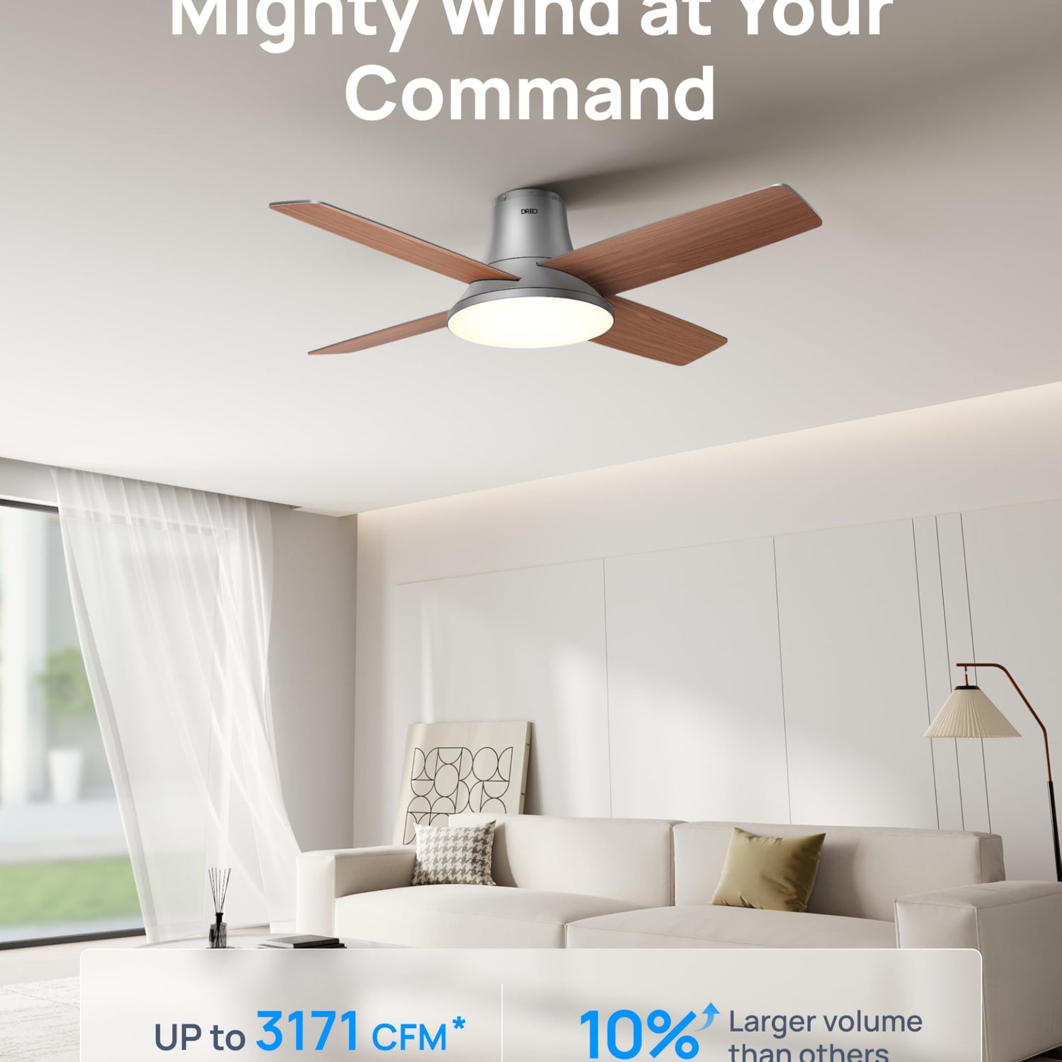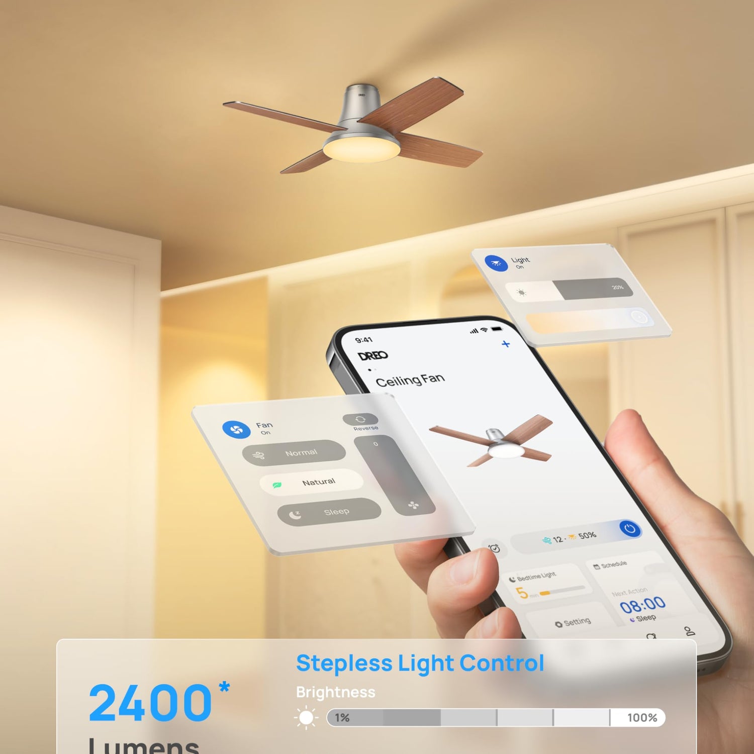 Dreo Ceiling Fans with Lights, 12 Speeds & 3 Fan Modes, Quiet DC Motor, Low Profile Easy to Install, Flush Mount Smart Ceiling Fan with Dimmable LED, 12H Timer for Bedroom, Remote, Silver, 44''