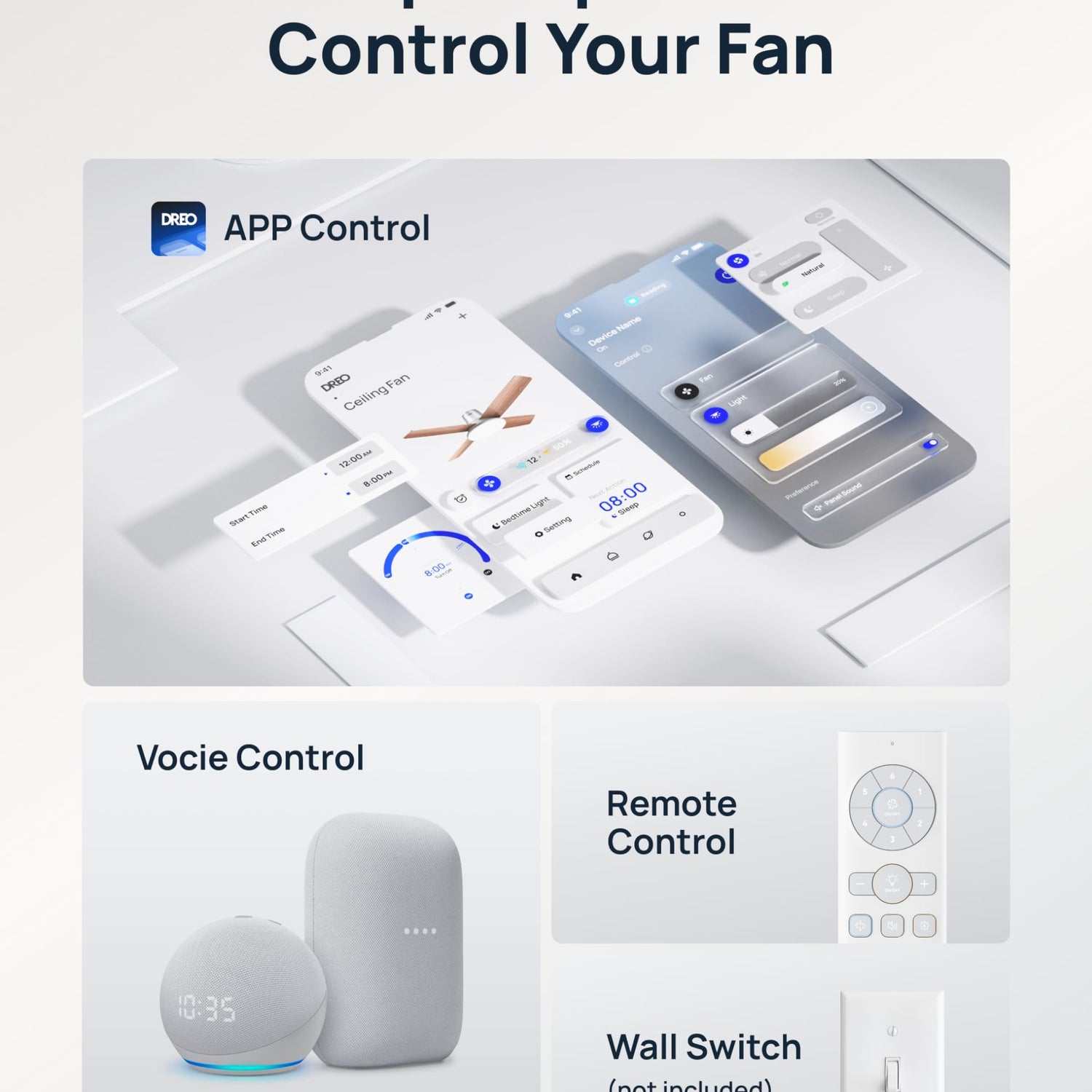 - Smart Ceiling Fan Experience: The DREO app, along with Amazon and Google Home voice command compatibility, allow convenient control of your ceiling fan. It enables setting schedules, adjusting lighting, fan settings, timers, and more.