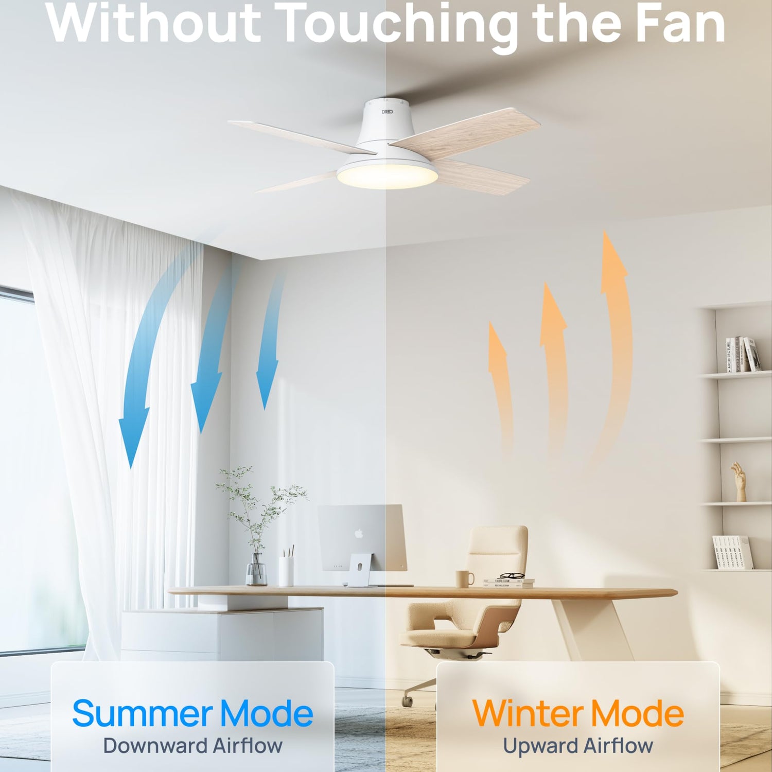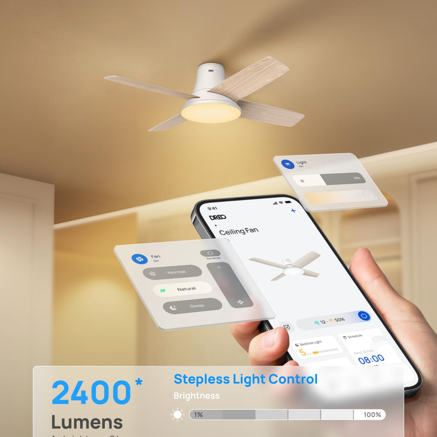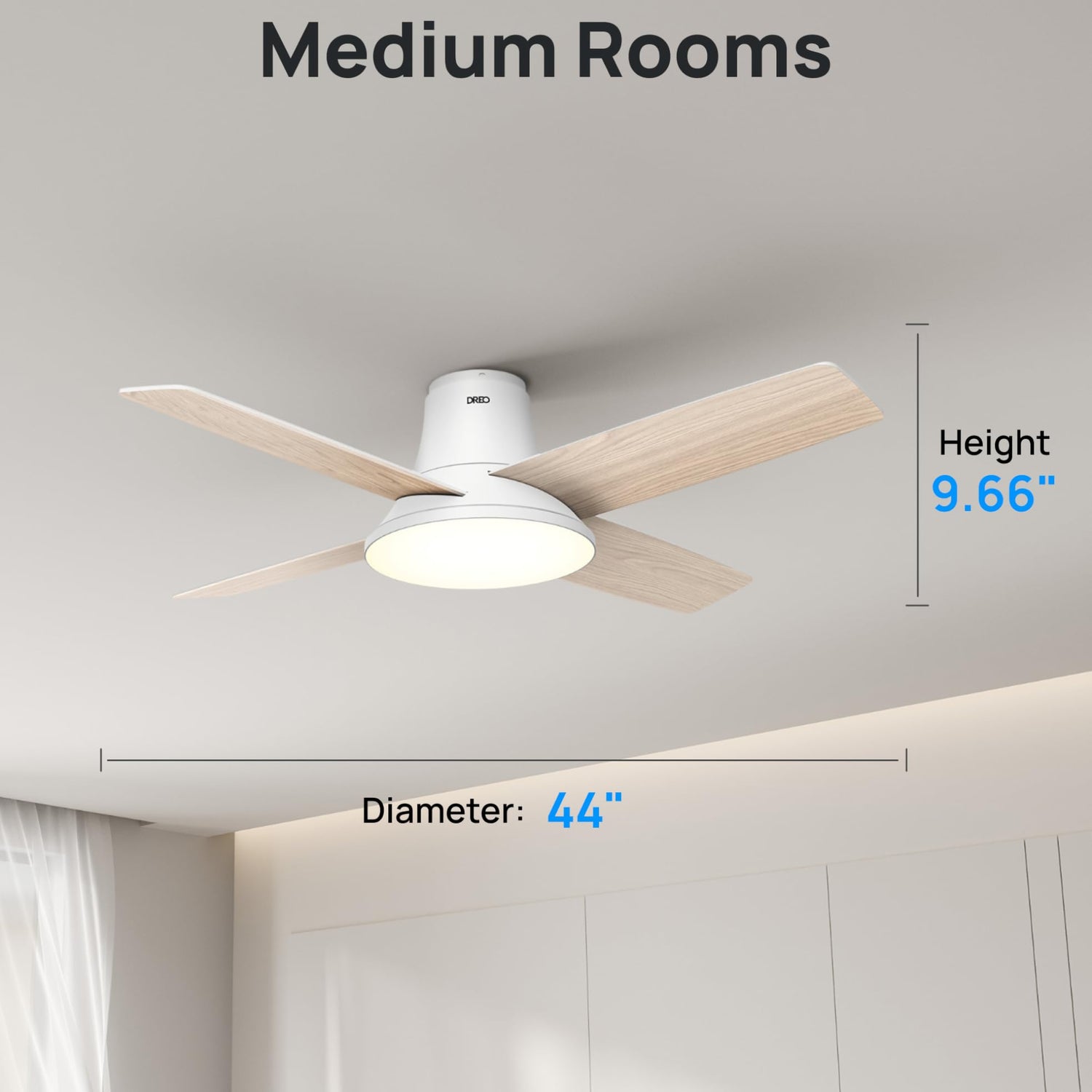 Dreo Ceiling Fans with Lights, 12 Speeds & 3 Fan Modes, Quiet DC Motor, Low Profile Easy to Install, Flush Mount Smart Ceiling Fan with Dimmable LED, 12H Timer for Bedroom, Remote, White, 44''