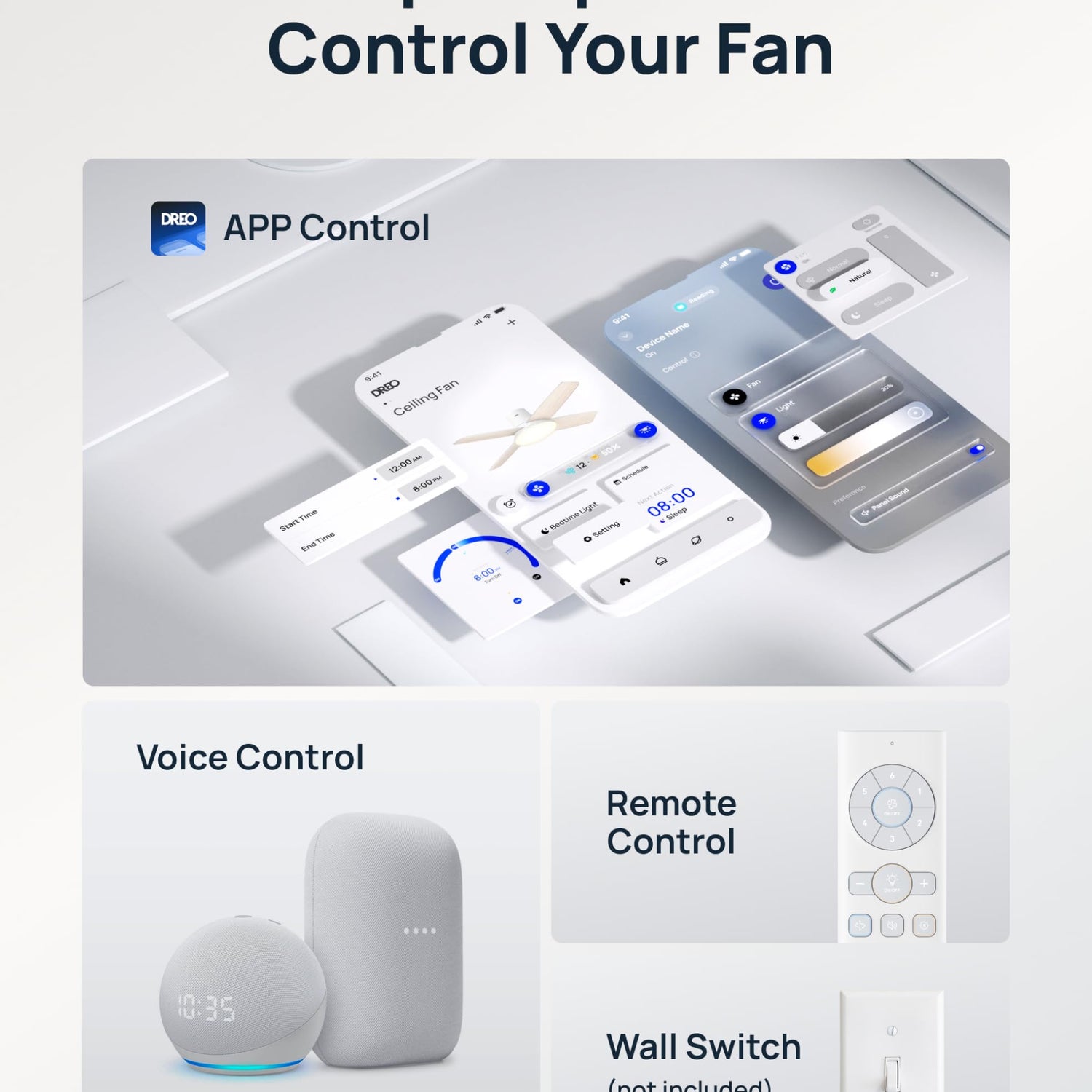 - Smart Ceiling Fan Experience: The DREO app, along with Amazon and Google Home voice command compatibility, allow convenient control of your ceiling fan. It enables setting schedules, adjusting lighting, fan settings, timers, and more.