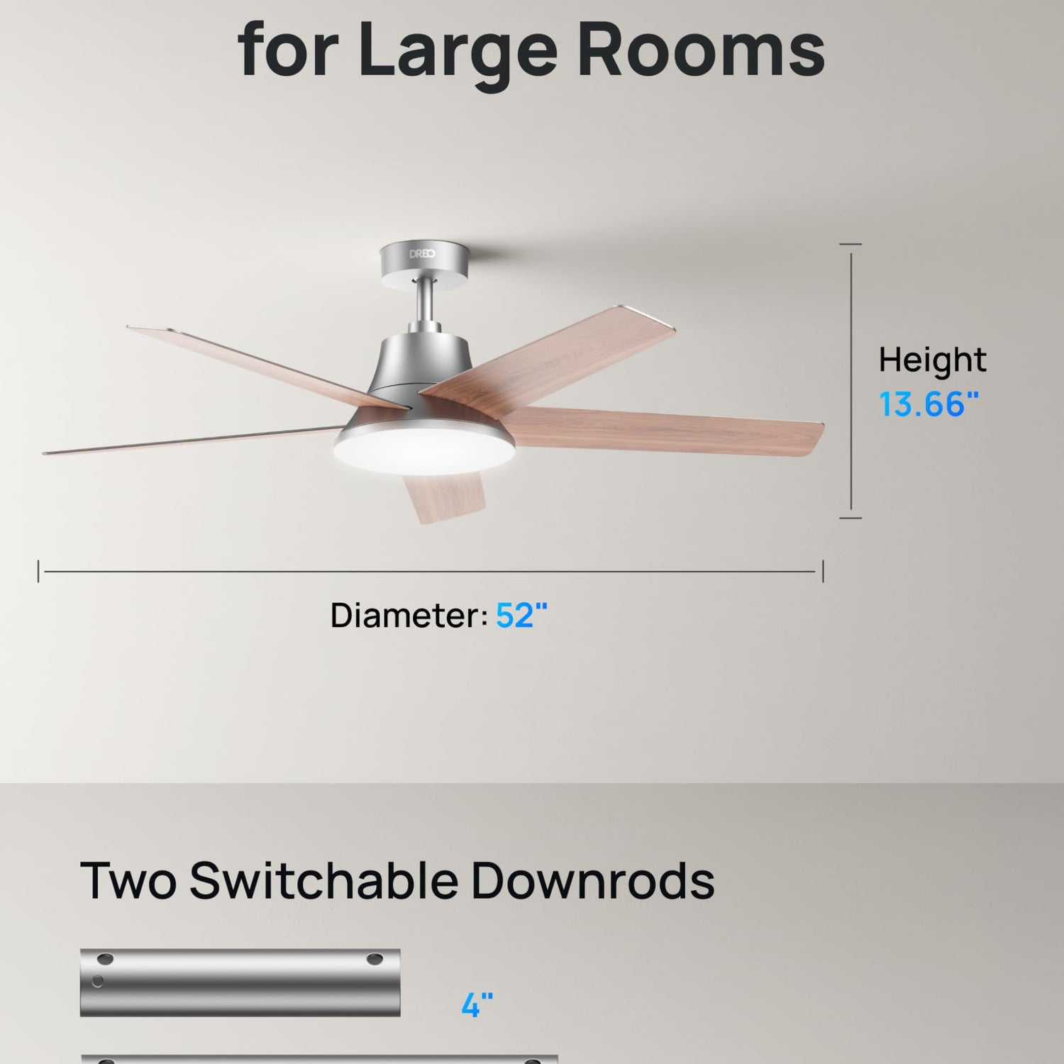Dreo Ceiling Fans with Lights and Remote, 52 Inch, 6 Speeds, 5 Color Tones Dimmable LED, Quiet Reversible DC Motor, 8H Timer, Silver Ceiling Fan for Bedroom, Living Room, Easy to Install