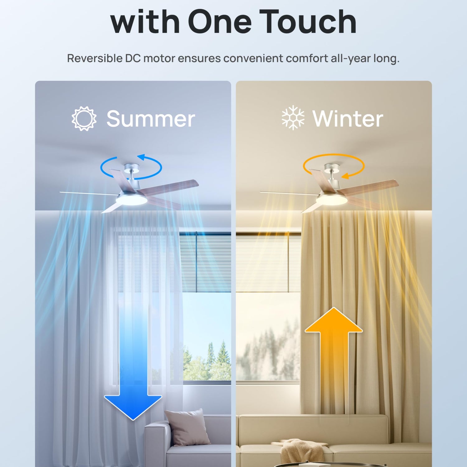- All-season Use with One Touch: Ventilate heat or cold air with the press of a button thanks to the reversible blade design and handy remote of ceiling fans for bedroom. Moving air downwards in summer or upwards in winter to help you save energy while staying comfy.
