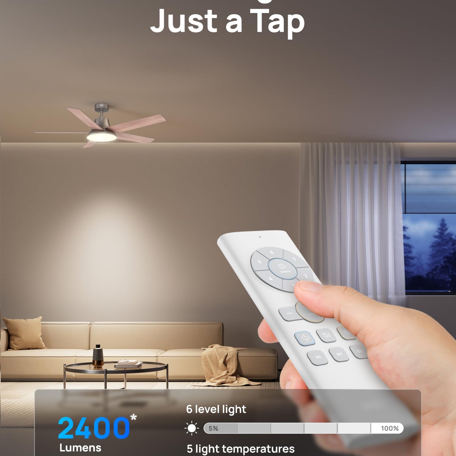 - Full Lightning Customization: This ceiling fan with LED light produces up to 2400 lumens (Equivalent to two 100-watt incandescent bulbs), you can set the ideal mood for working,dinning or even sleeping with 6 different brightness options (0% to 100%), and 5 different light tones (from 2700K warm yellow to 6500K cool white).