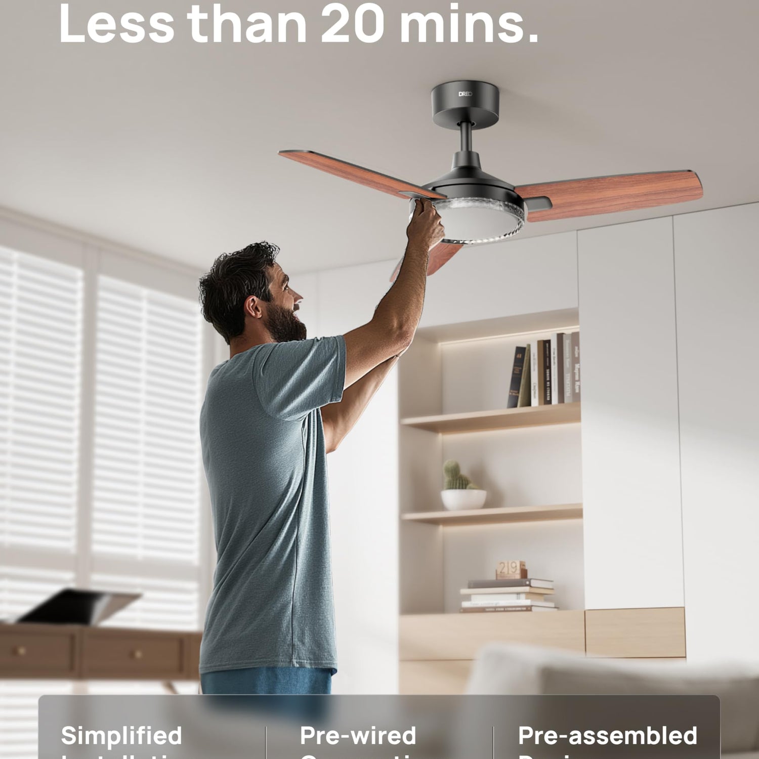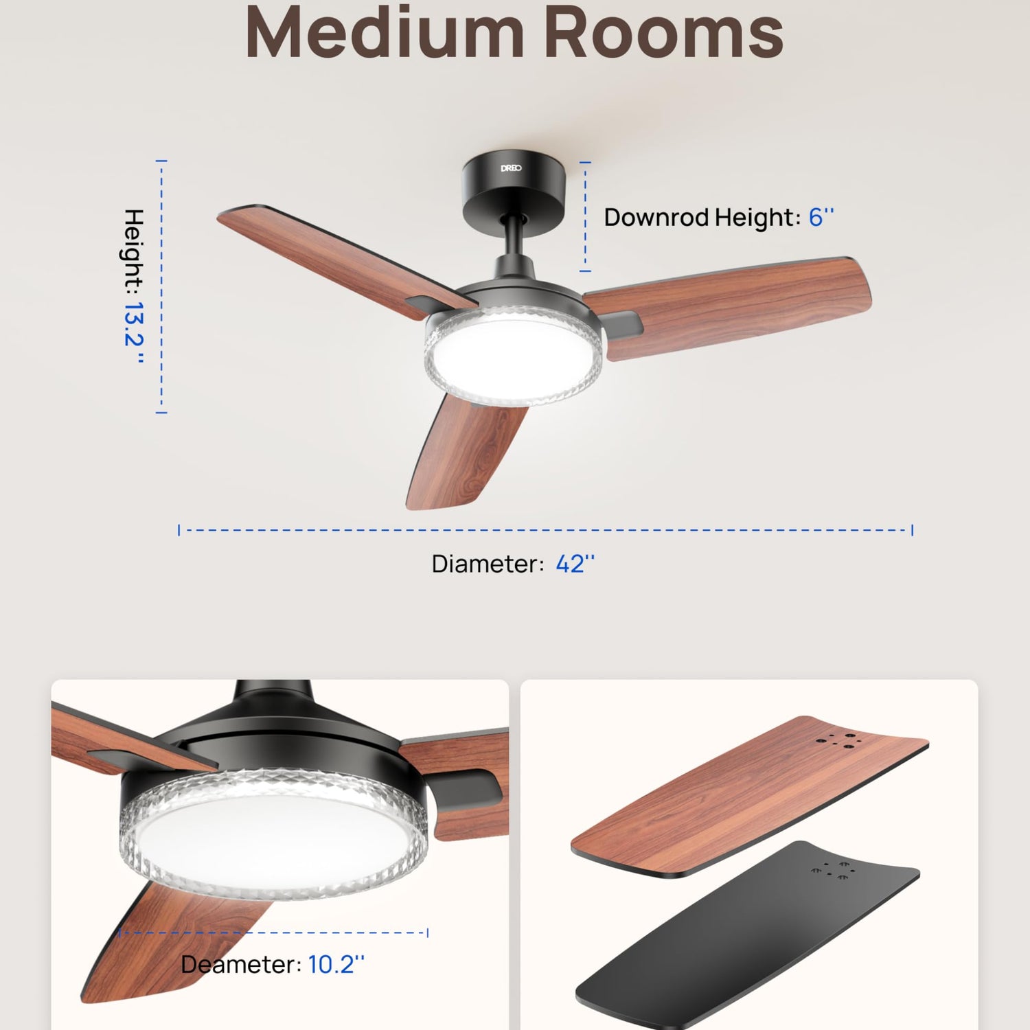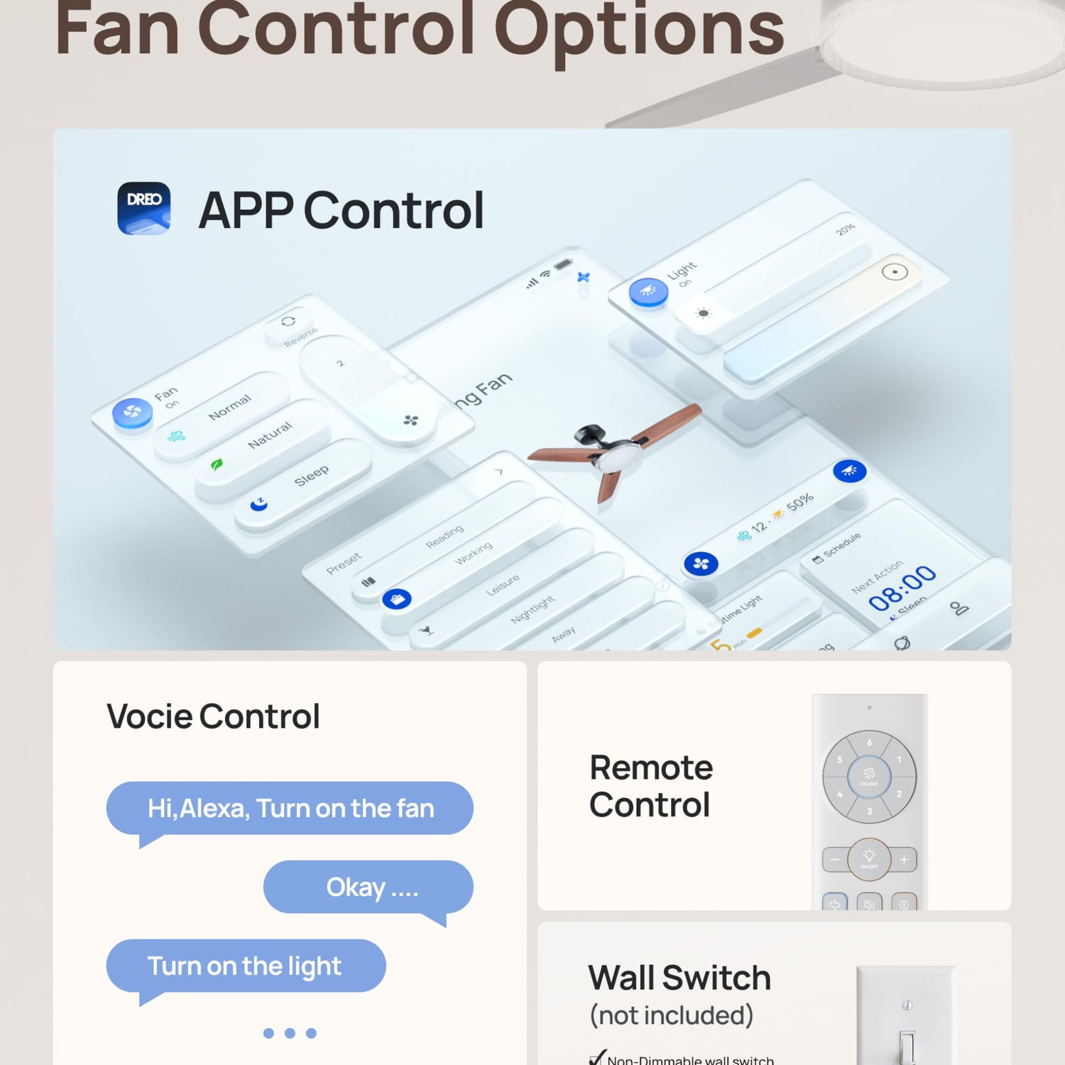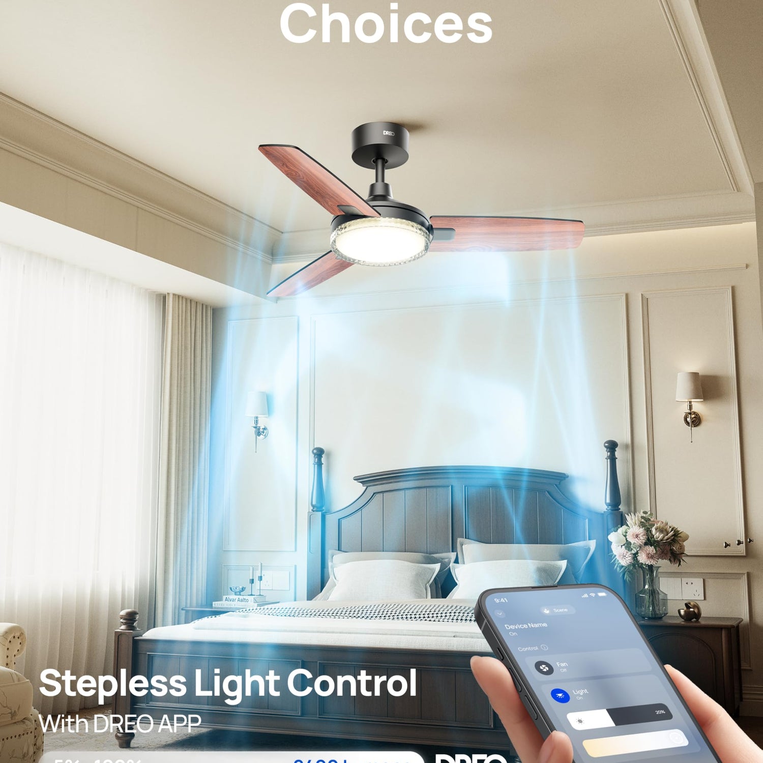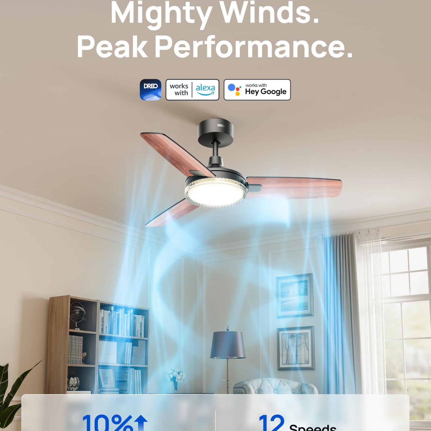 • Smart Ceiling Fan Experience: Switch fan speeds, scenes, brightness and timers using the DREO app, Alexa and Google home voice commands to tailor every setting to your needs.