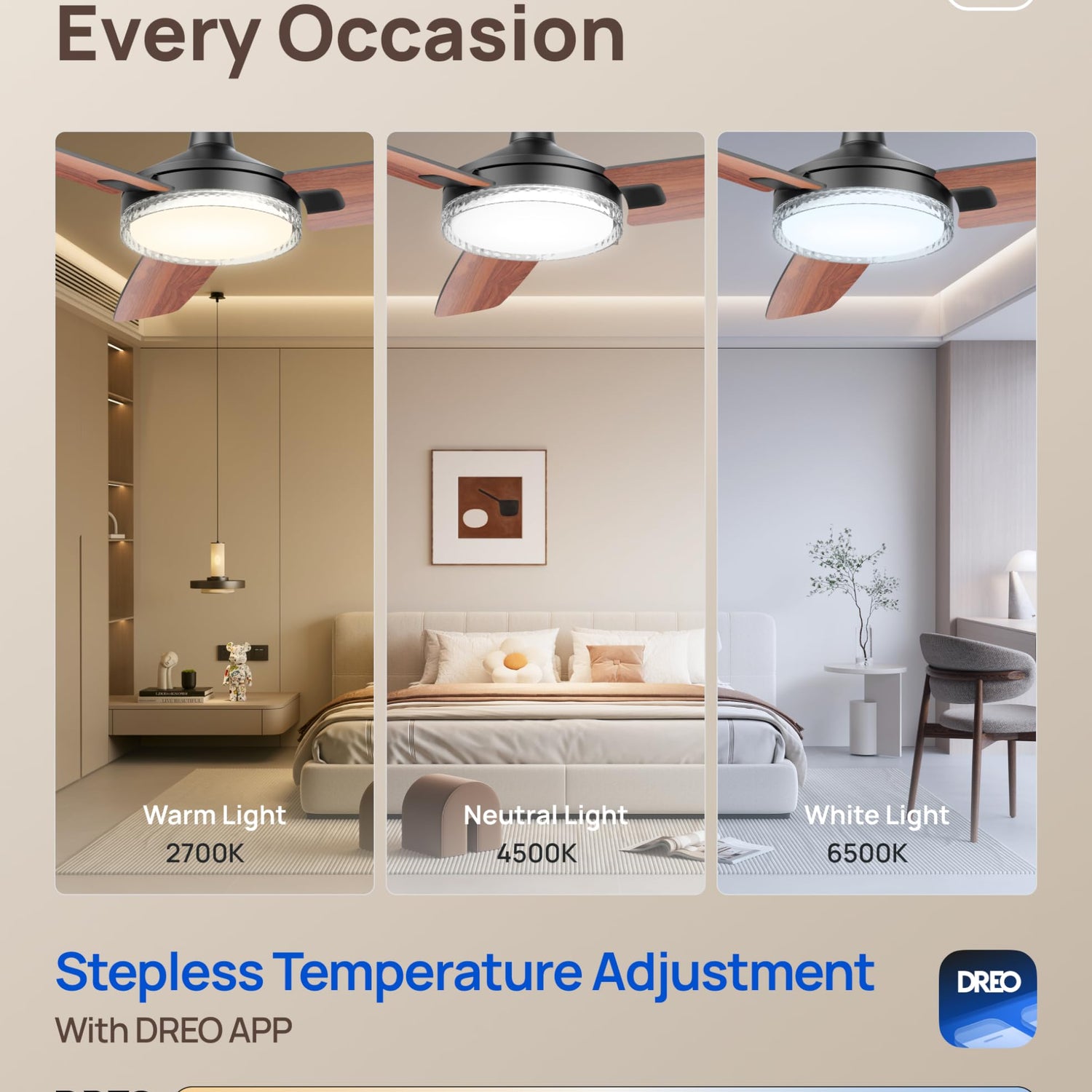 • Ultra Bright Custom Lighting: The 2400lm modern ceiling fan with light features stepless brightness(5%-100%) and 27% wider color range (2700-6500K) or schedule auto-scenes like sunrise/sunset via DREO app.