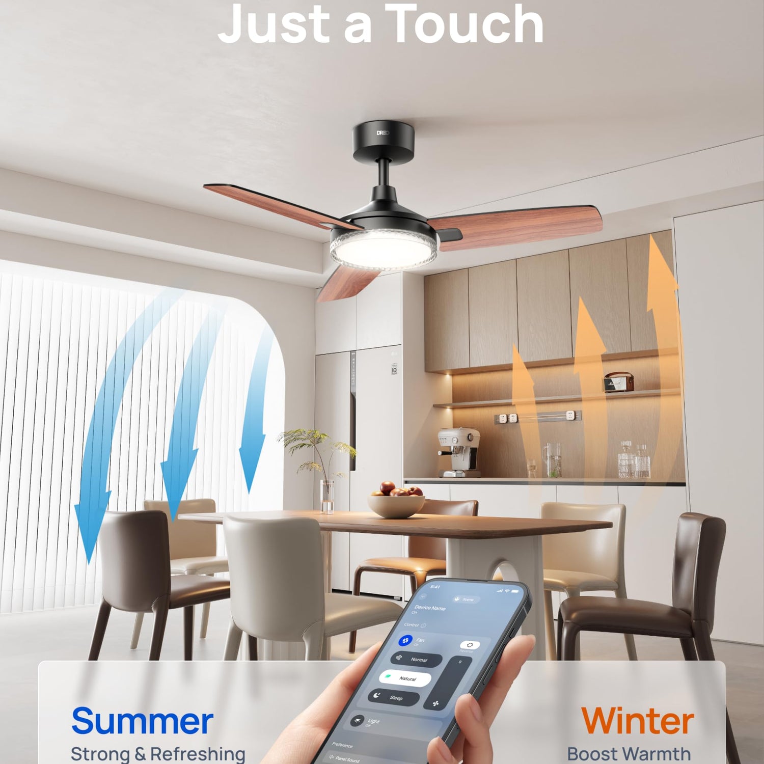 • One-tap reversal, year-round comfort: With the remote or app, easily switch your living room ceiling fan's direction from summer’s downward wind to winter’s upward, enhancing AC & heater efficiency while using 50% less energy (certified by FTC) without the need to manually dissassemble your ceiling fans with lights each season.