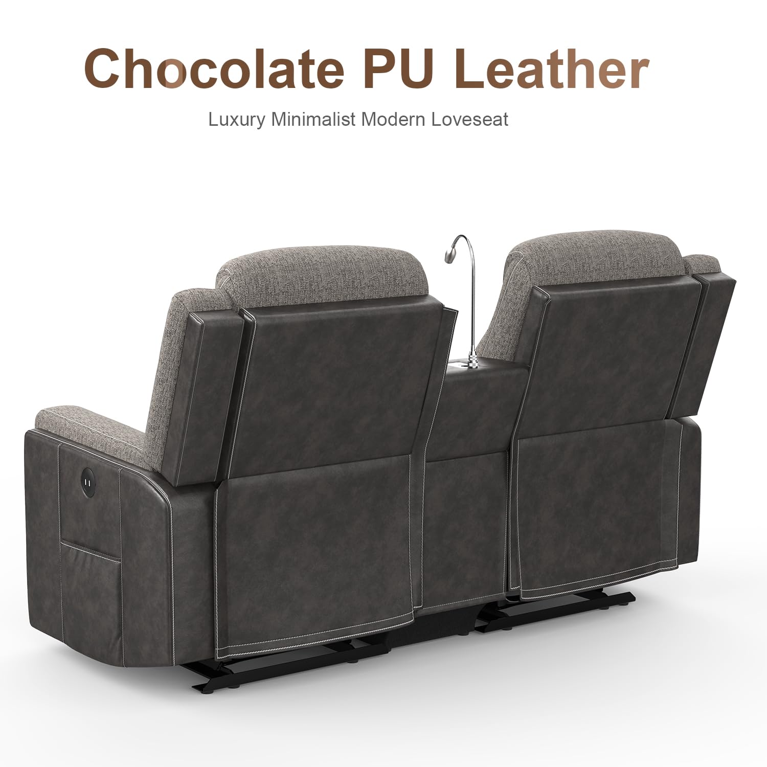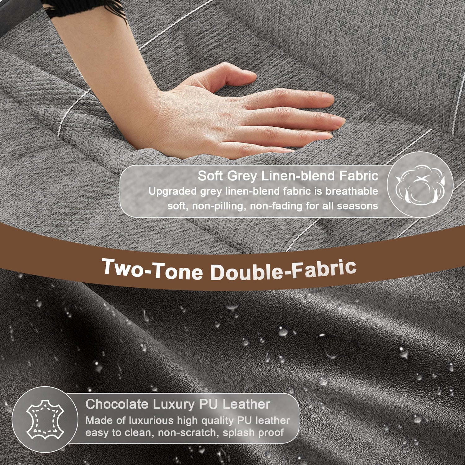 - 【 Two-Tone Design in Grey Fabric & Chocolate PU Leather】 This stylish reclining loveseat pairs breathable, soft grey linen-blend fabric with rich, wipe-clean chocolate PU leather. Its dual-texture design is colorfast, pet-friendly, and modern—perfect for your living room, RV, or office relaxation zone