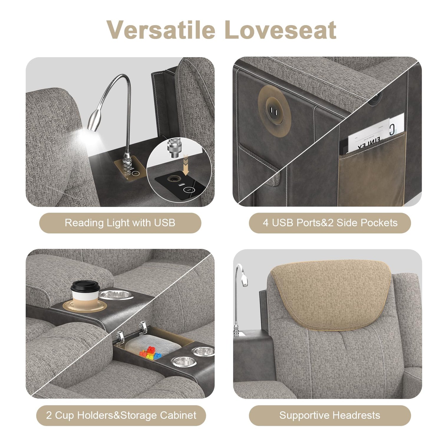 - 【360° Adjustable Reading Light with USB Charging】 Enjoy Dresegmt loveseat recliner sofa personalized lighting with a touch-controlled, 3-level brightness reading light that swivels 360°. Perfect for late-night reading or TV, this loveseat also features a built-in USB port—charging your phone or tablet while with your loved ones relax in your home theater recliner