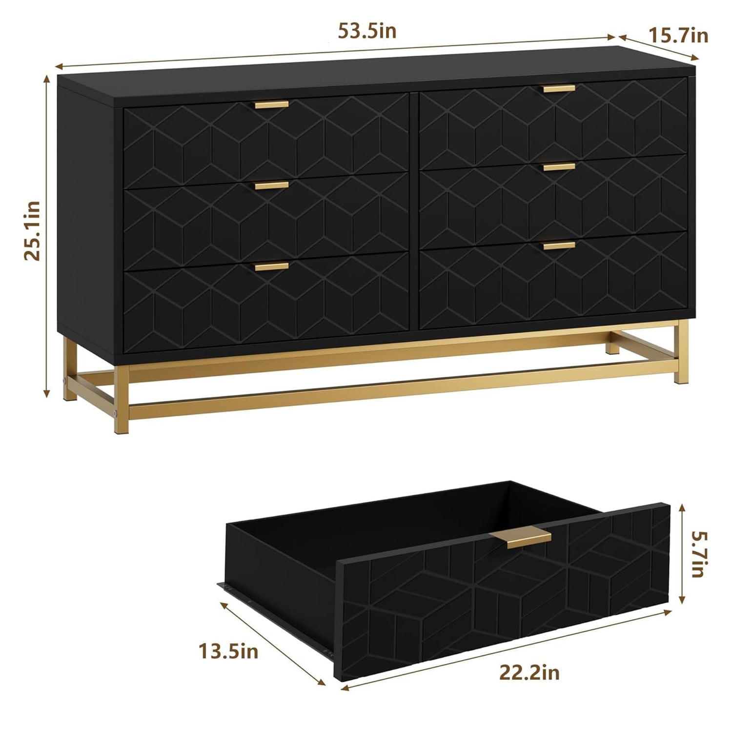 Details: Dresser for Bedroom, 53.5" Large Dresser Organizer, 6 Drawer with Golden Metal Handle and Legs, Modern Chest of Drawers, Black Dressers with Drawers for Closet, Hallway, Living Room, Entryway