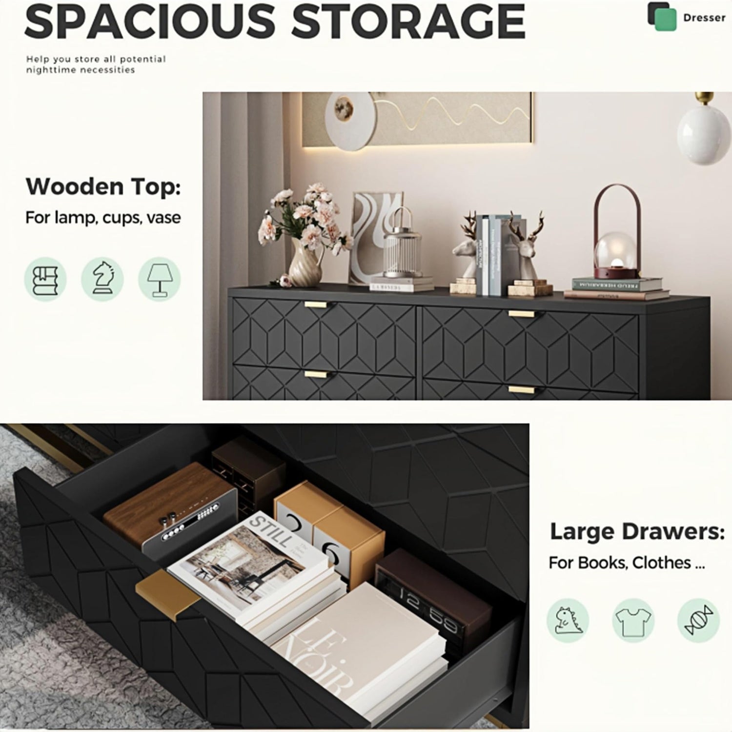 - Elegant & Stylish - The dresser for bedroom has a unique groove design with a golden base and handles, highlighting an elegant and fashionable atmosphere. This dresser becomes the best decoration for the bedroom and can be easily matched with various styles, adding special charm to the space.
