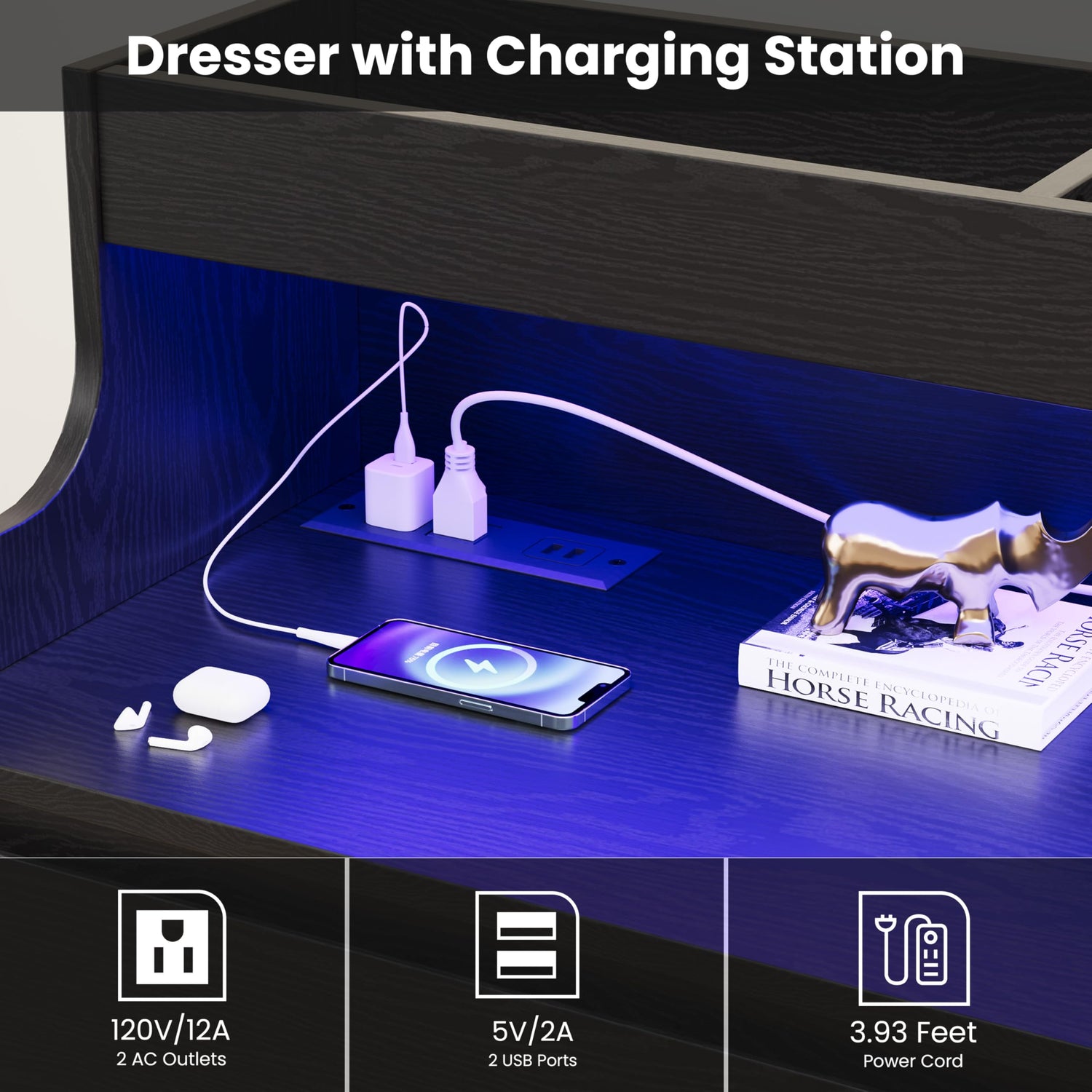 - 【Perfect for Every Space】This modern black chest of drawers, equipped with LED lights and a charging station, adds elegance and brightness to your room, reflecting your taste. It can fit in any corner of your home, serving multiple purposes. Use it to store clothes or blankets in the bedroom, organize books and miscellaneous items in the living room, keep toys in the kids' room, or utilize it as a makeup cabinet. This functional and attractive cabinet makes a wonderful gift for family or friends