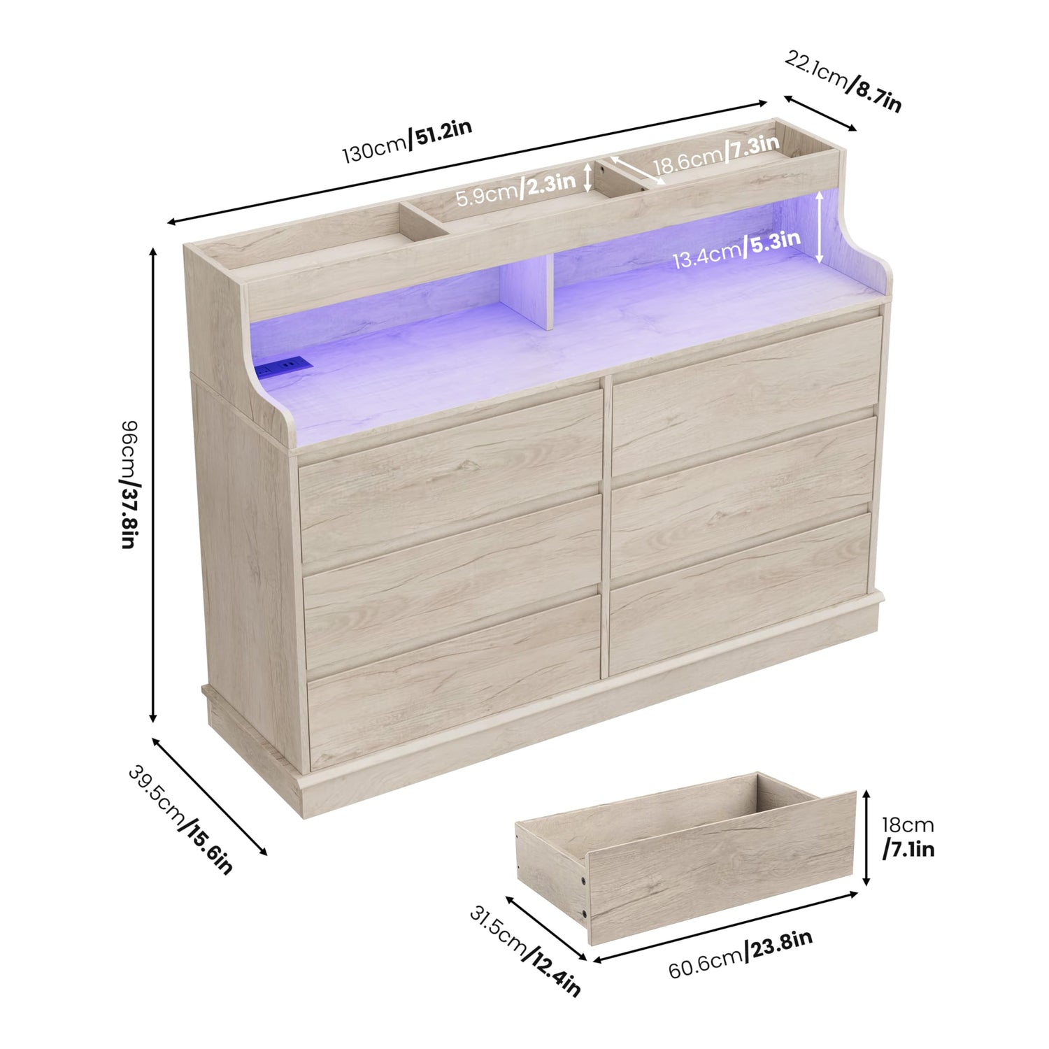 - 【Clutter-Free Storage Solutions】The LED wooden drawer dresser features 6 roomy storage drawers to accommodate your clothes, toys, books, or other personal belongings. The open shelf on top and large surface area can be utilized to display or store frames, vases, books, or other decorative items. This design helps you easily organize and manage clutter! Its overall dimensions are 51.2" (W) x 15.6" (D) x 37.8" (H).