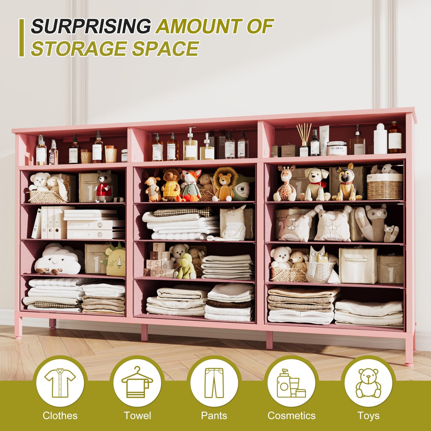 Dresser for Bedroom Bedroom Pink Dresser with LED Lights and Charging Station, 12 Long Fabric Drawers Dressers, Tall Wide Chest of Drawers Storage Organizer TV Stand for up to 65" TV for Living Room