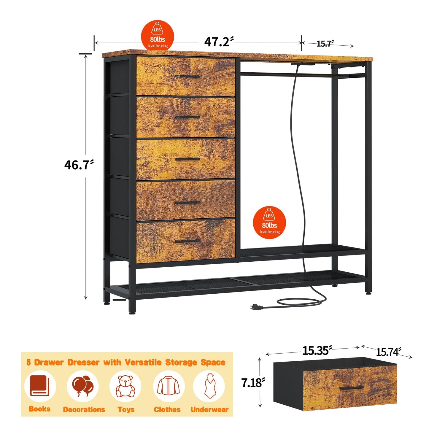Dresser for Bedroom, Dresser with Hanging Rack Led Lights and Charging Station, Bedroom Dresser with 5 Fabric Chest of Drawers with PU Finish Storage Organizer, for Living Room Kids Room Closet, Brown