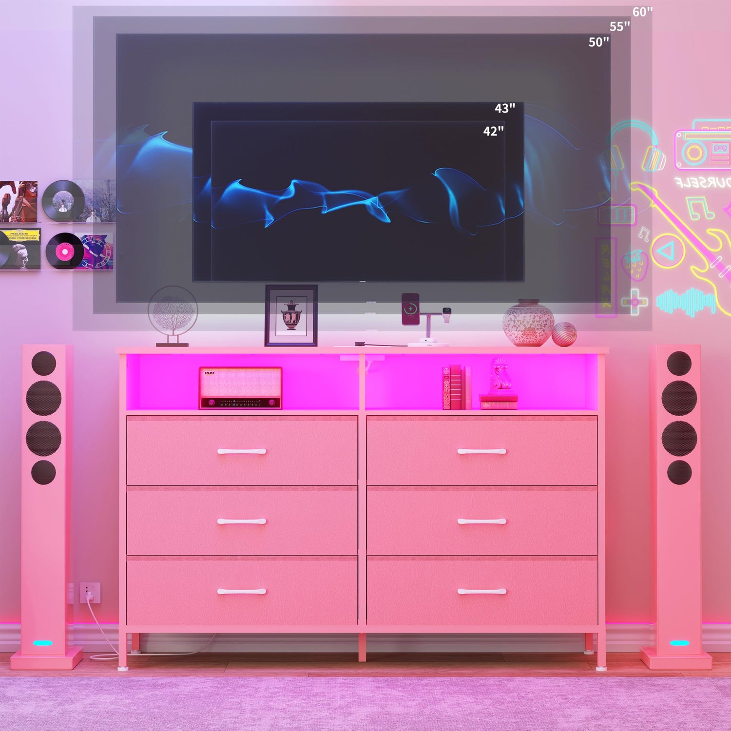 Dresser for bedroom, Pink Bedroom Dresser with LED Lights and Charging Station, 6 Long Drawers Dressers, Tall Wide Fabric Chest of Drawers Storage Organizer TV Stand for up to 60" TV for Living Room