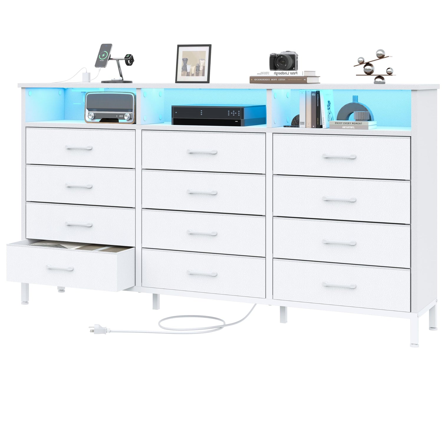 Dresser for Bedroom White Bedroom Dresser with LED Lights and Charging Station, 12 Long Fabric Drawers Dressers, Tall Wide Chest of Drawers Storage Organizer TV Stand for up to 65" TV for Living Room