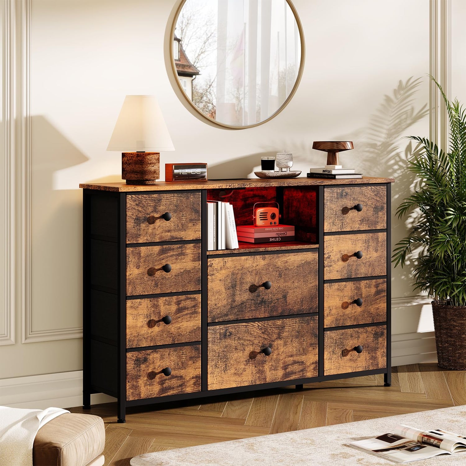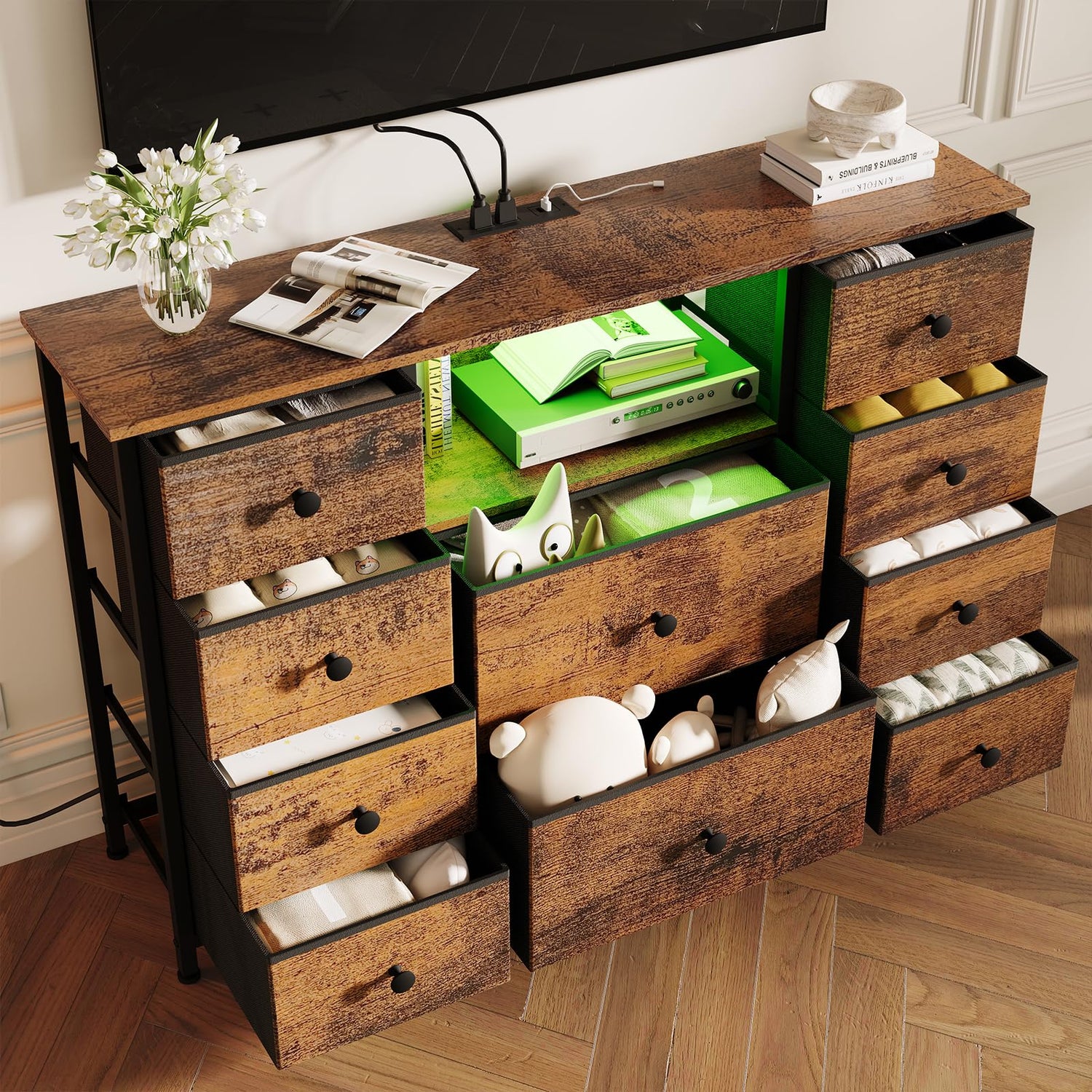 Dresser for Bedroom with 10 Drawers, Storage Organizer TV Stand for 55" TV with LED Lights and Sockets, Fabric Chest of Drawers with PU Finish for Kid Room, Entryway, Living Room, Hallway, Brown