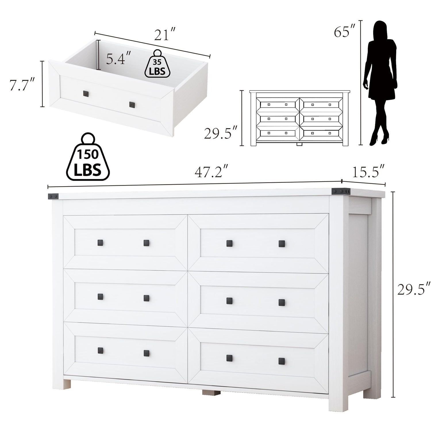 Dresser for Bedroom with 6 Drawers, Farmhouse Wood Chest of Drawers, Wide TV Stand Closet Storage Furniture with Metal Handle, Modern Clothes Organizer for Hallway, Living Room, Entryway, White