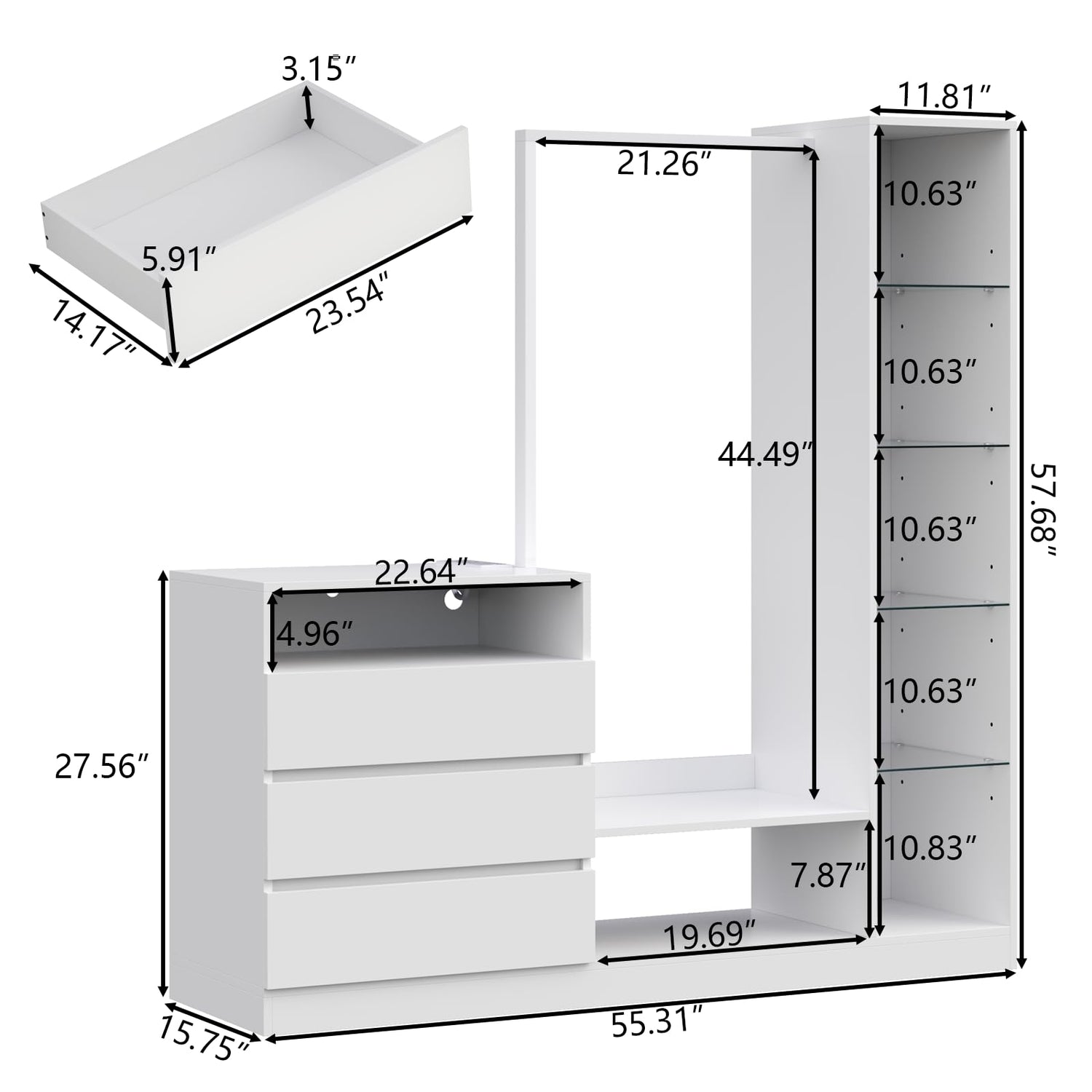 - [Multi-functionality Dresser with Clothes Rack]- Not limited to just storage, this modern dresser organizer with LED lights practicality with aesthetics. The drawer dresser with glass shelves can be used not only as a closet organizer system, but also as a display cabinet to show off your bags, decorations, or collectables, making it a practical and attractive addition to any space. Wherever it is placed, it will become the focal point of your home decor, offering enduring aesthetic value.