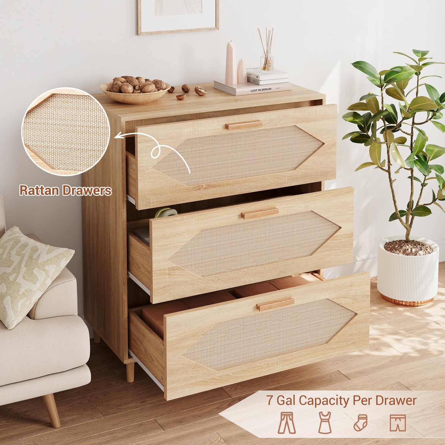 - 【Durable and Easy Maintenance】 Constructed with wood legs, MDF body, and a waterproof surface, this dresser is built to last and withstands everyday wear. The rattan design is breathable and resistant, helping protect stored items, while the top is easy to clean, keeping your space tidy with minimal effort.