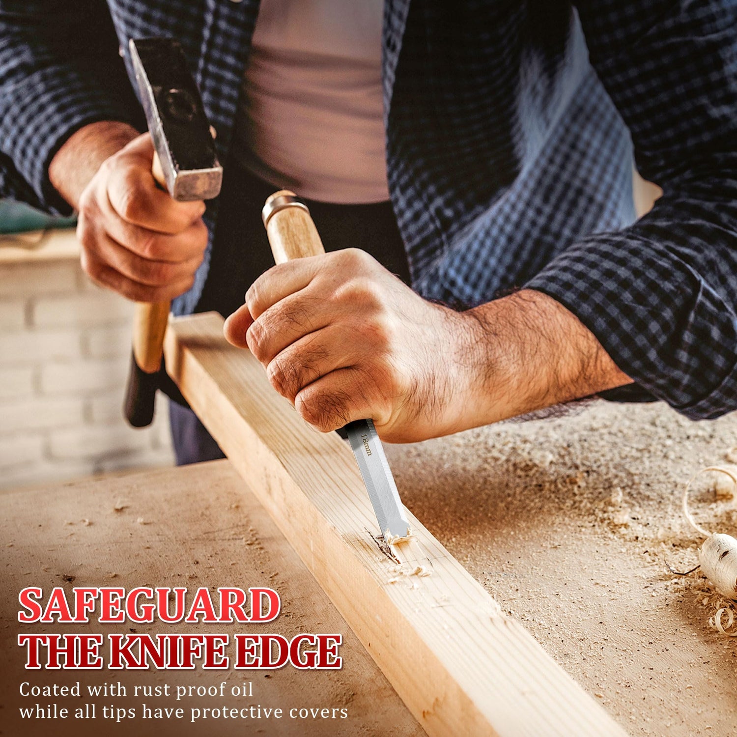 - Quality Wood Chisels: the wood chisel crafted from quality chrome vanadium steel with increased hardness and enhanced wear resistance, featuring precise and sharp edges. The sharp beveled edge facilitates high precision engraving on various soft wood, hard wood, and laminated wood products. Solid wood handle, the end of the handle plus the hoop metal ring, resistant to hammering, not easy to deformation fracture