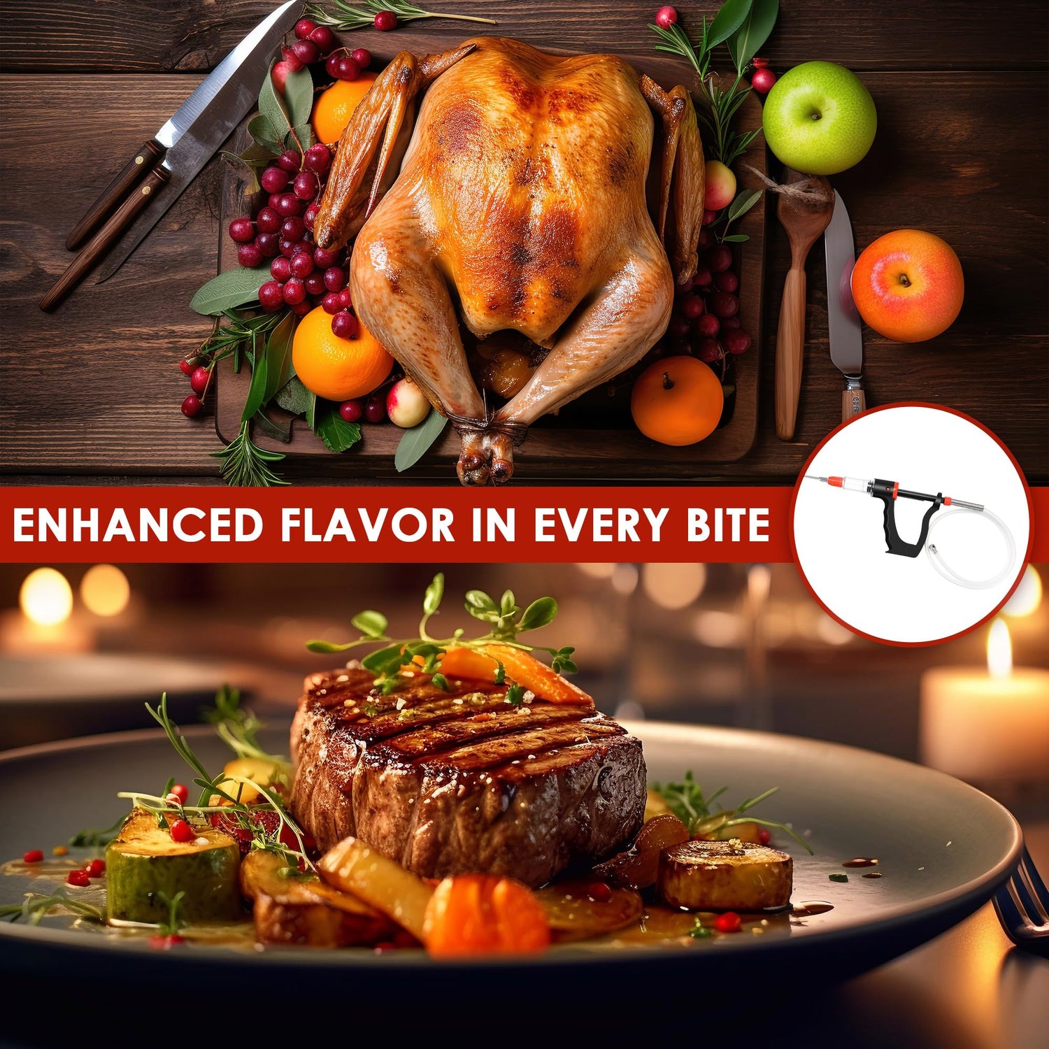 Details: Our flavor injector is perfect for elevating the taste of any meat dish, ensuring deep and even marinade distribution. This versatile turkey injector kit is designed to inject flavor into turkey, chicken, beef, pork, and more. Made from durable, food safe materials, it’s built to last and ideal for regular use in the kitchen or at your next BBQ. The included 33.46in hose ensures smooth, uninterrupted flow, allowing for even and thorough marinade application, making this meat flavor injector a must have for any cooking enthusiast.