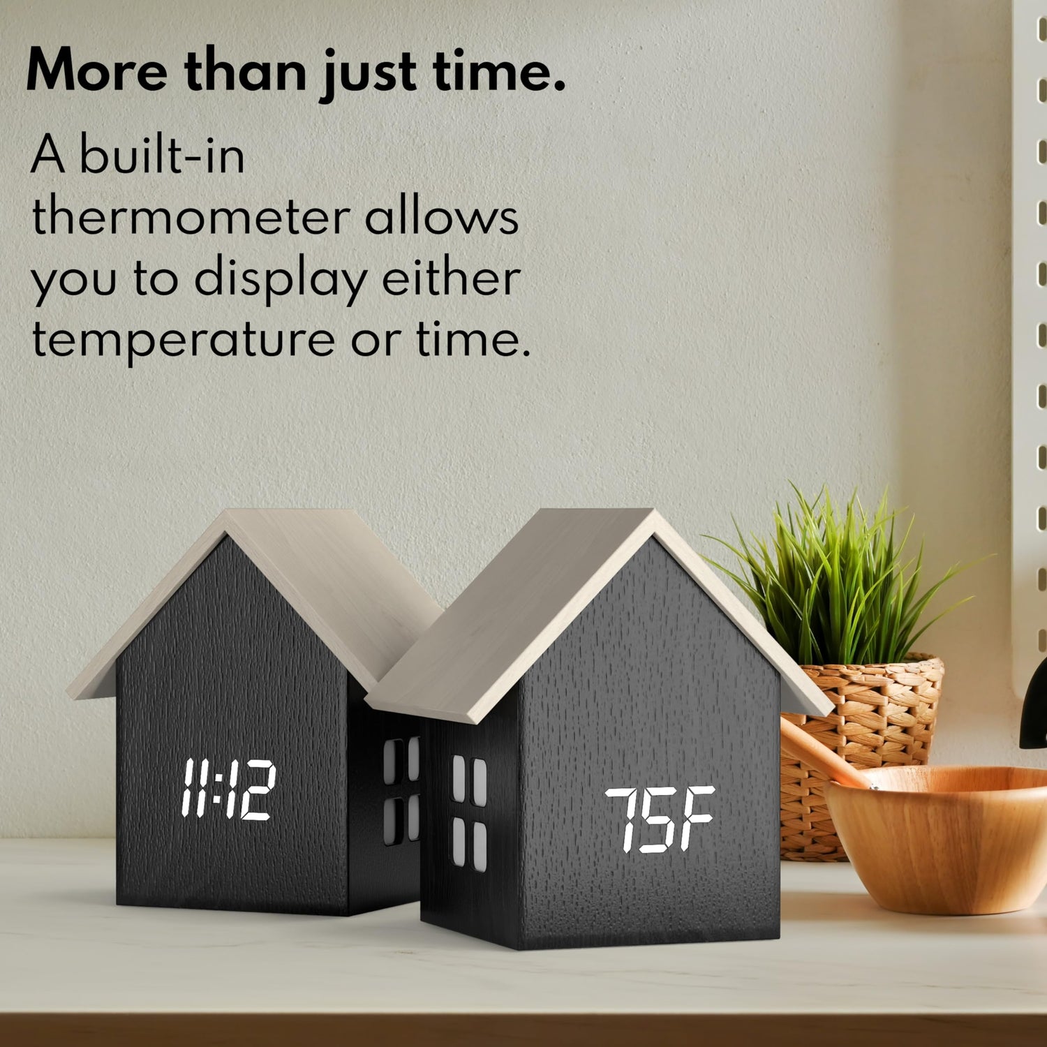 Driini Digital House Shaped Alarm Clock with Temperature Display (Dark Wood) – Modern Aesthetic with Cute Cube Frame and White LED Dimmer - Perfect Small Desk Clock for Bedside Table or Bedroom Mantle