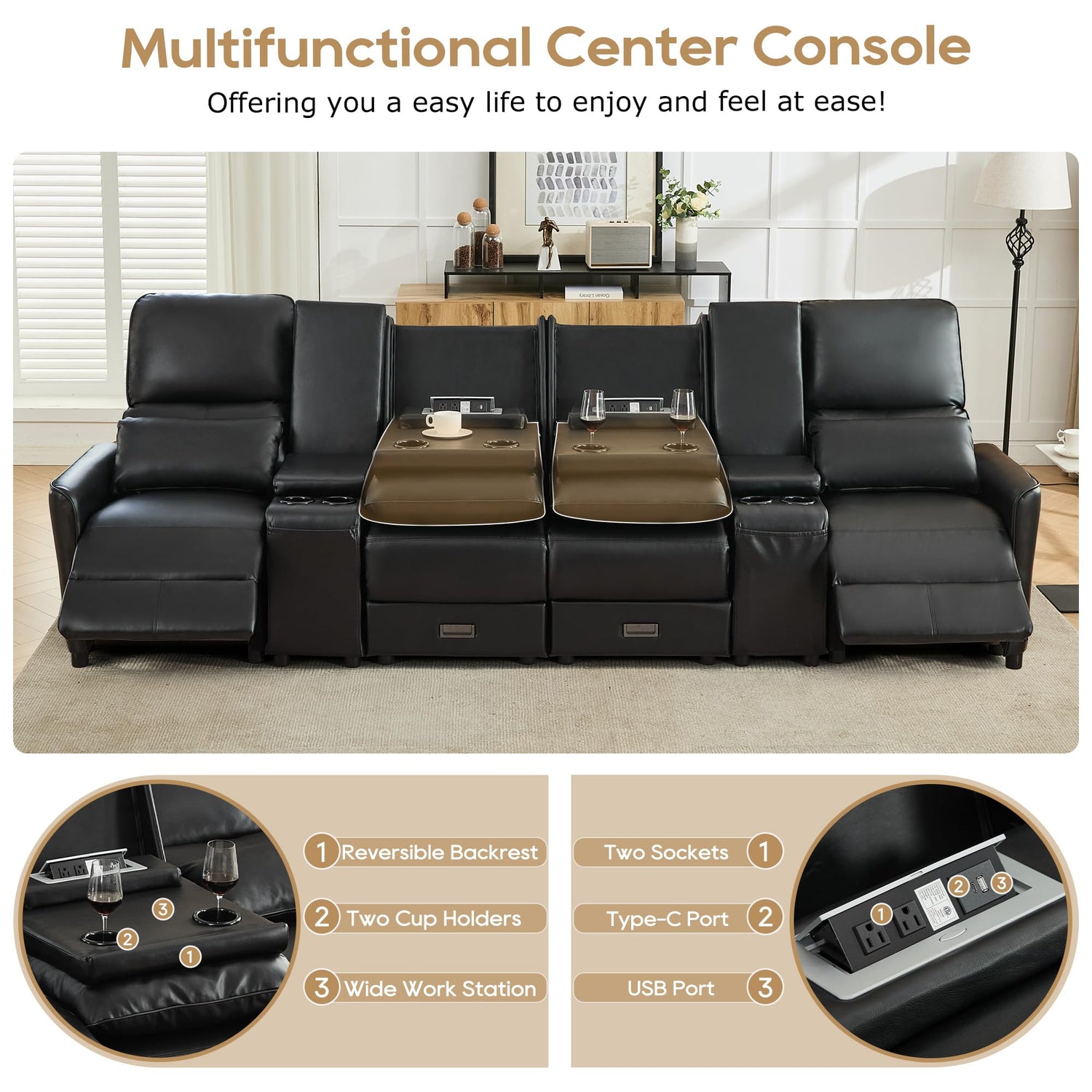 - Push Back 4 Person Reclining Sofa: Each seat can independently recline and the extendable footrest allows for full body stretch. Whether for reading, watching TV, or taking a nap, our recliner is designed to meet a variety of needs with ease