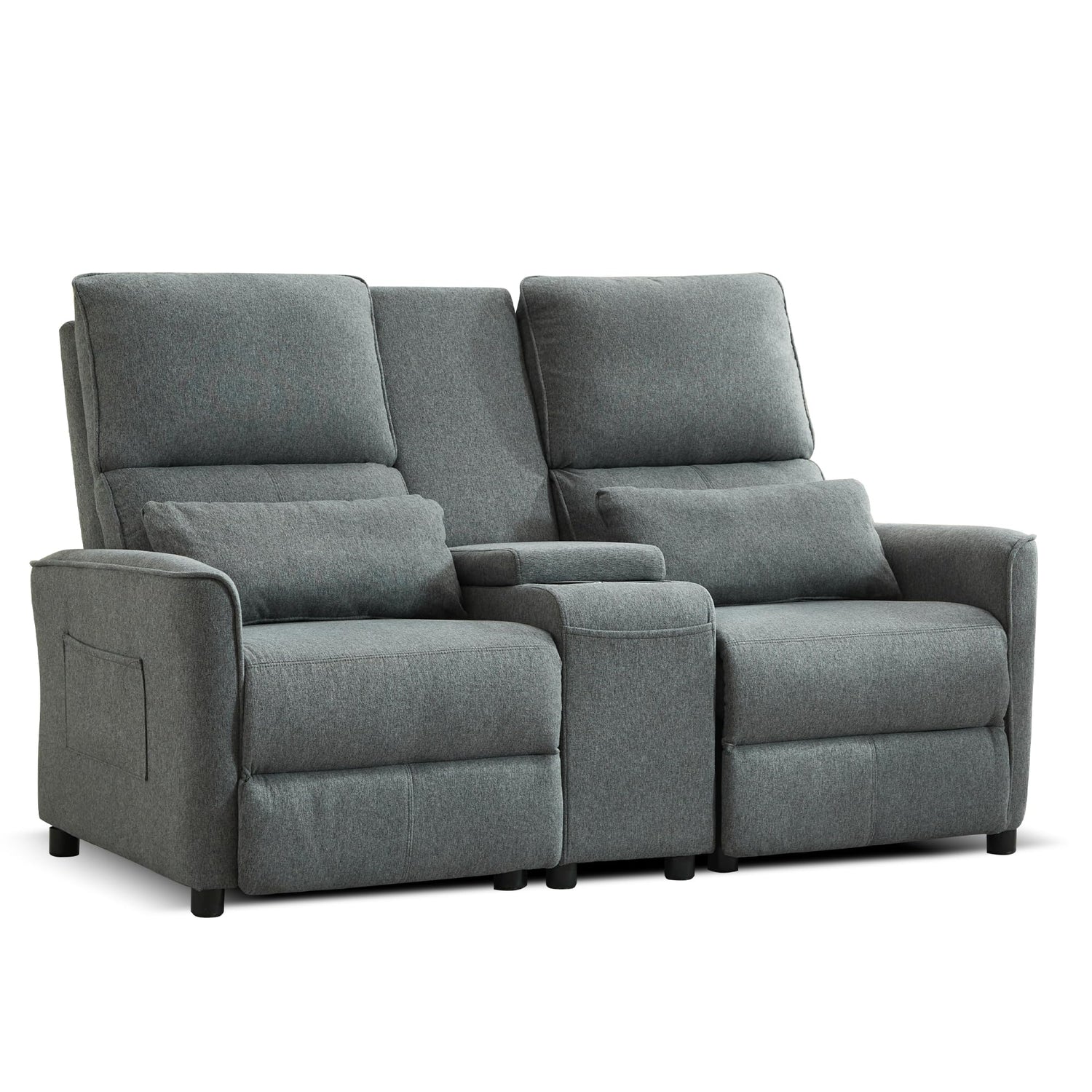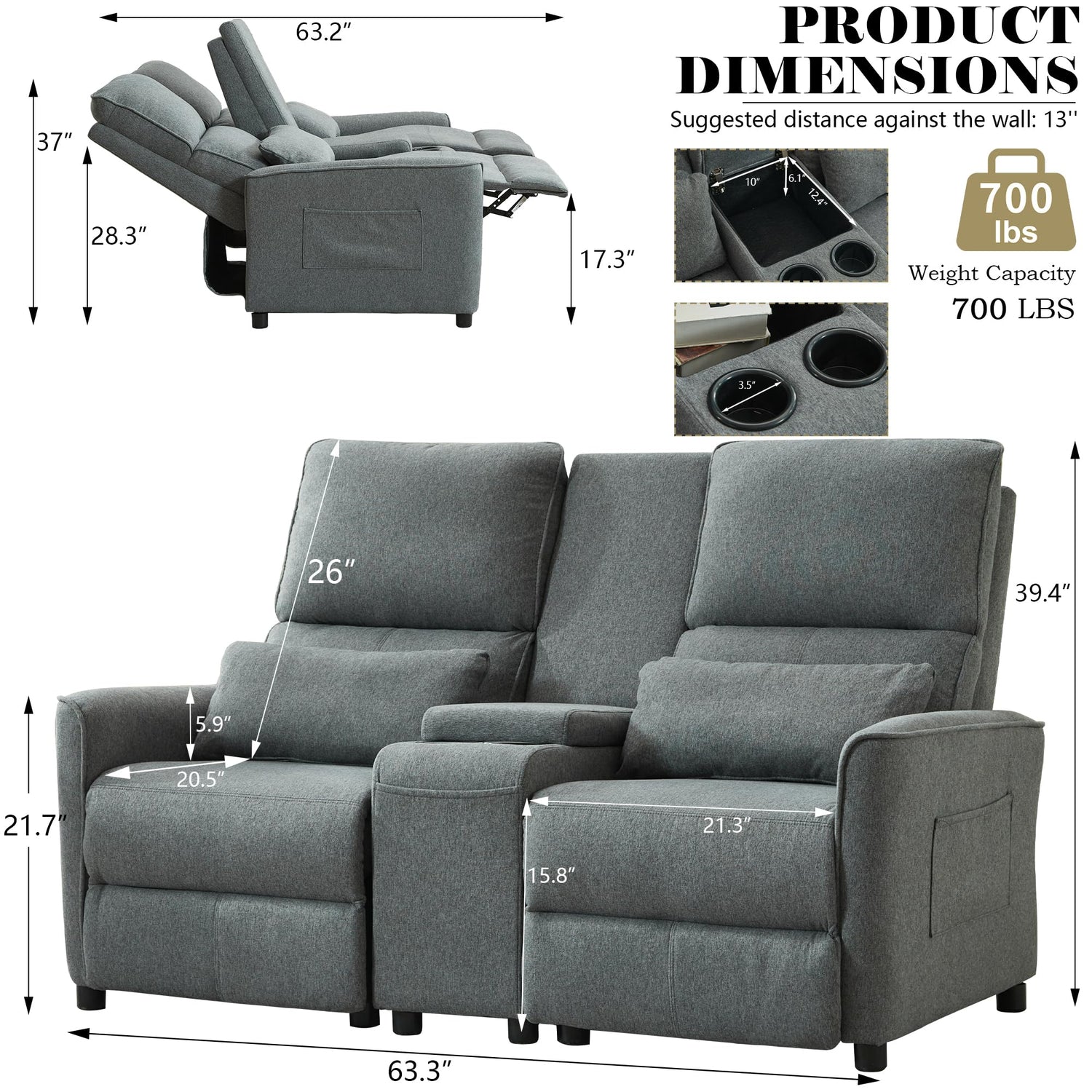 DRMBOOK 63'' RV Loveseat Recliner Sofa, Linen Fabric Double Camper Couch 2 Seater Recliner with Console, Home Movie Theater Seating Chair, 2 Person Push Back Recliners for Living Room, Grey