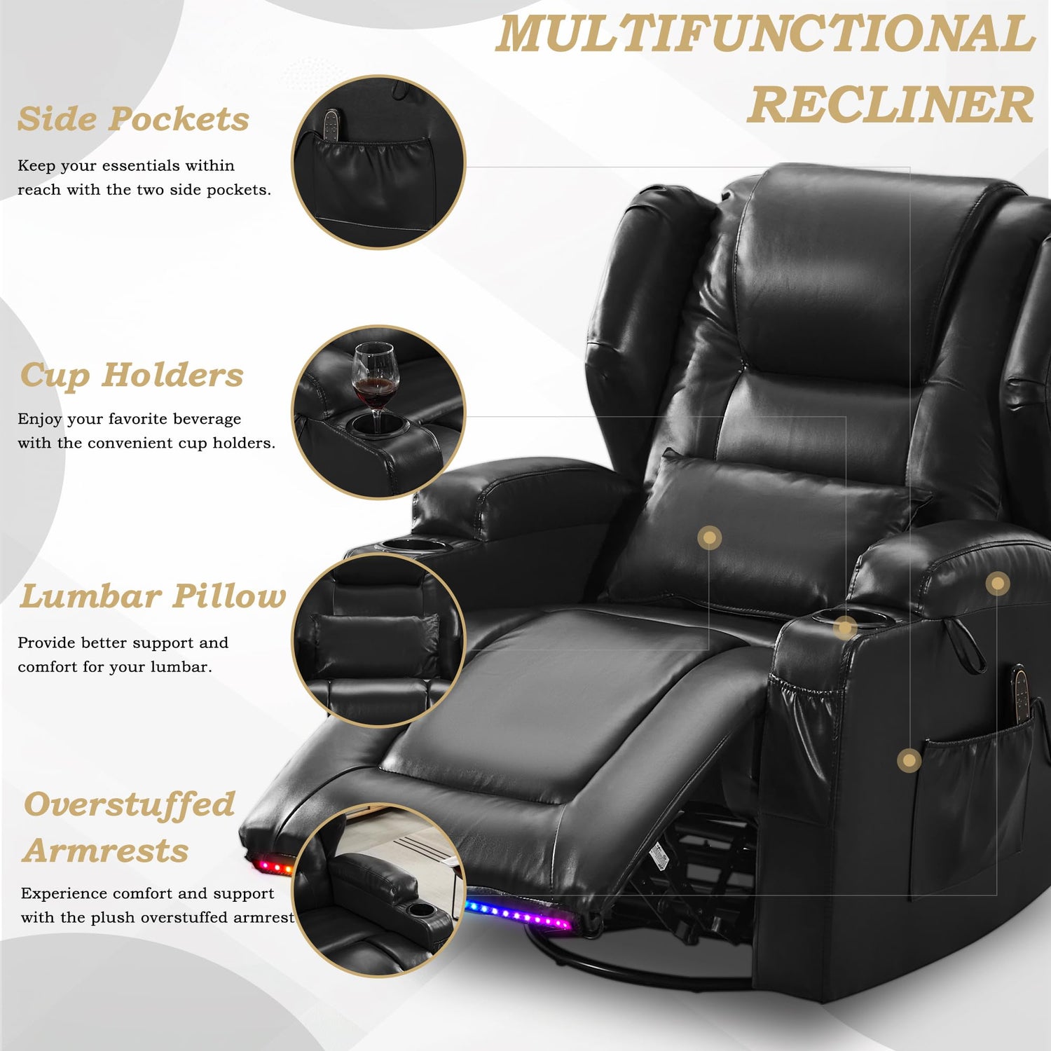 DRMBOOK Leather Rocker Recliner Chairs for Adults, 360° Swivel Rocking Theater Seating with Heat and Massage, Oversized Single Sofa with Led Lights for Living Room (Black,Single Chair)