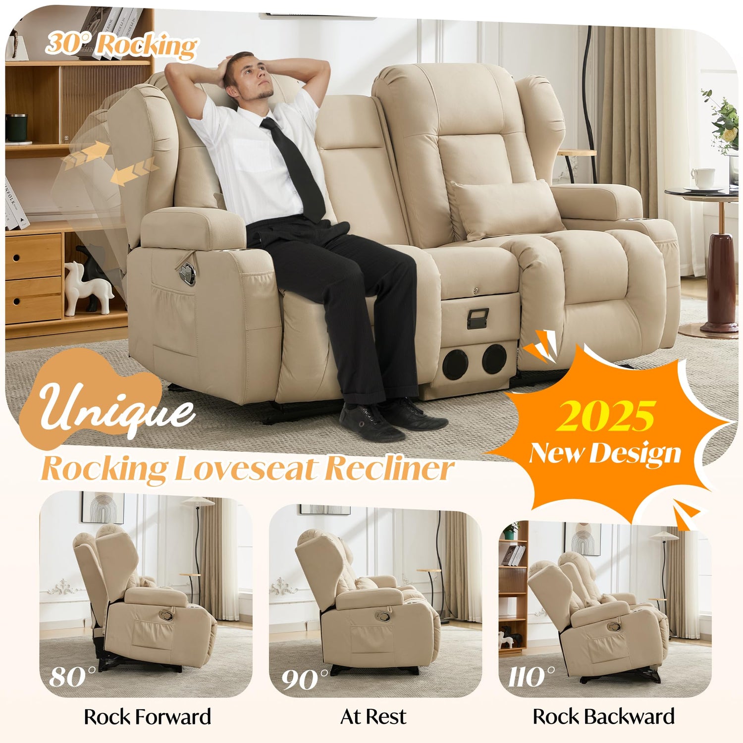 - Loveseat Rocking Recliner Sofa: Unlike standard reclining loveseat sofa, this loveseat recliner is engineered with a unique 30-degree rocking angle—delivering the perfect balance of motion and stability for a more relaxing and soothing experience
