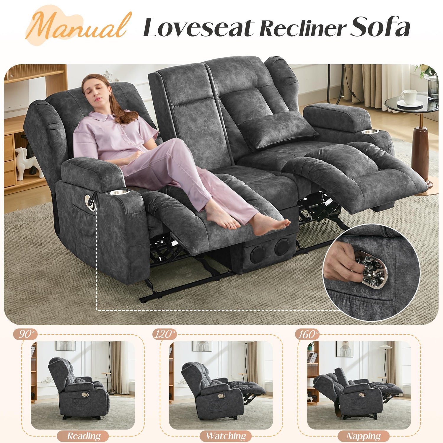 - Manual Dual Recliner Loveseat Chair: Each seat can recline between 105° and 160°. The extendable footrest allows for full body stretch. Whether for reading, watching TV, or naping, our recliner is designed to meet a variety of needs with ease