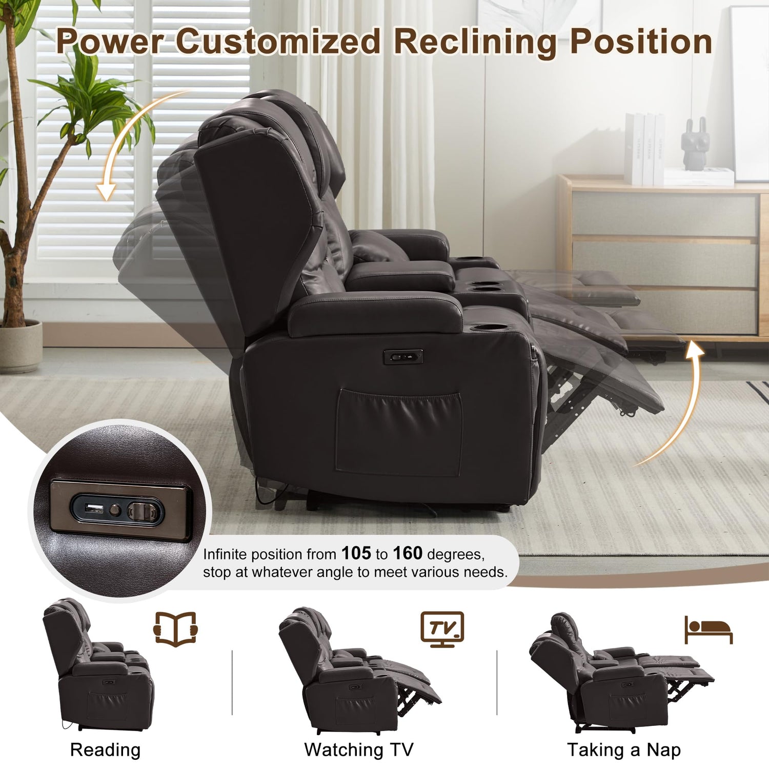 DRMBOOK RV Power Loveseat Recliner Sofa, Faux Leather 3-Seater Wall Hugger Reclining Sofa, Home Theater Seating Chair with Cup Holders, 3 Person Couch RV Furniture for Living Room, Brown