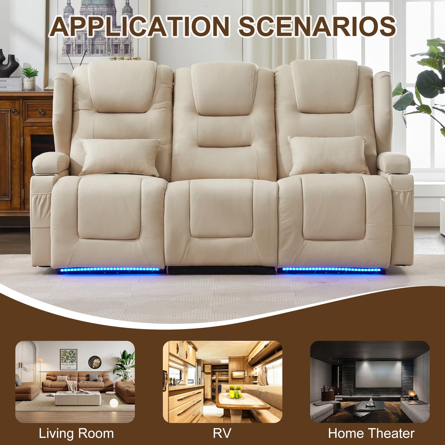 DRMBOOK RV Power Loveseat Recliner Sofa, Leathaire Fabric 3-Seater Wall Hugger Reclining Sofa, Home Theater Seating Chair with Cup Holders, 3 Person Couch RV Furniture for Living Room, Beige