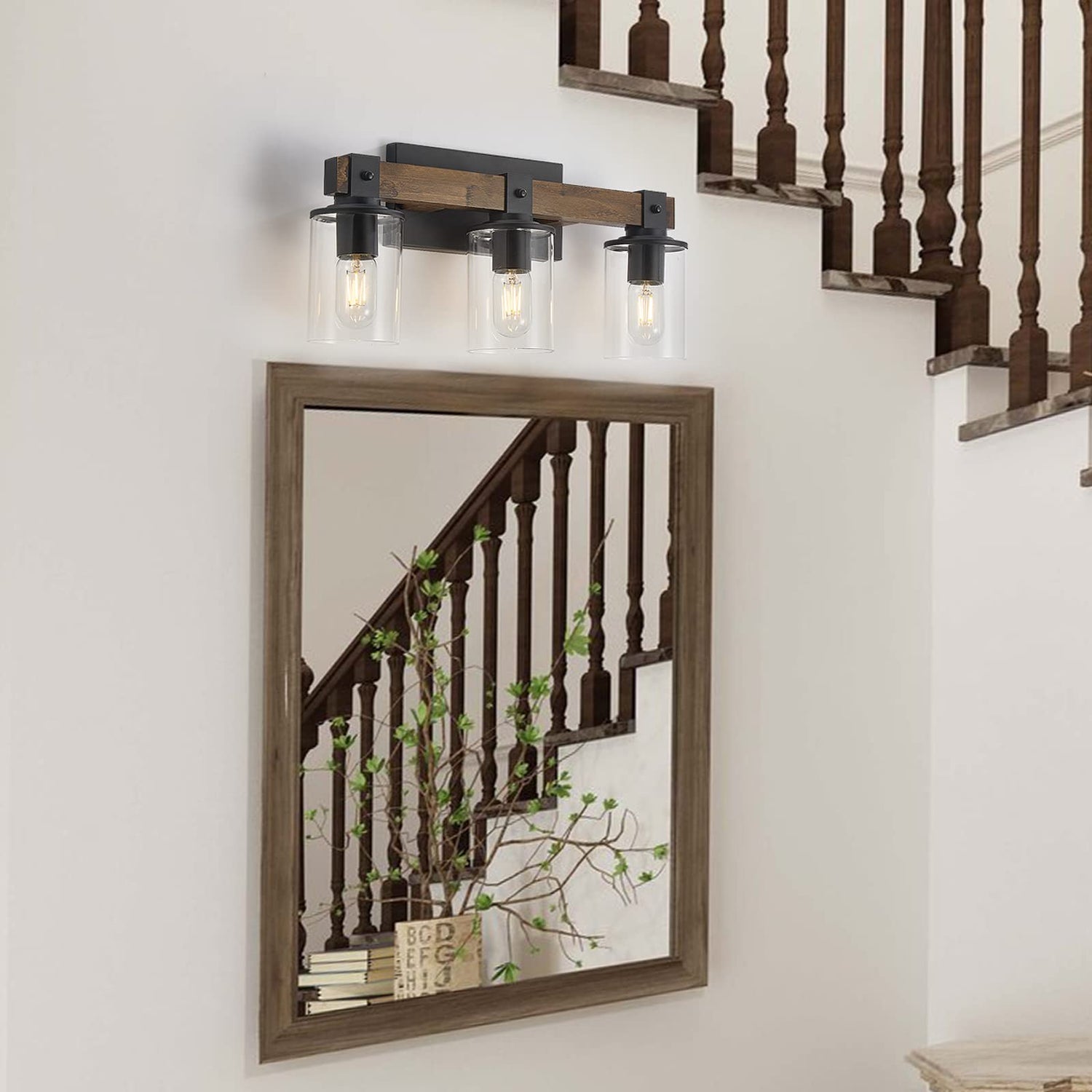 DRNANLIT Wood Vanity Lights,3-Light Farmhouse Bathroom Lighting Fixtures with Clear Glass Shade,Industrial Vintage Rustic Wall Lamp for Bedroom,Living Room,Hallway (3-Light, Antique Wood)