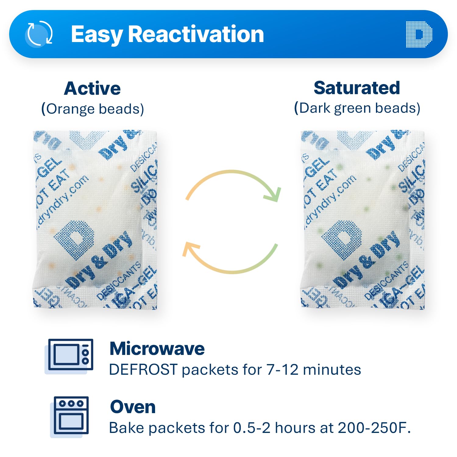 - [ULTIMATE MOISTURE ABSORPTION AND EASY REACTIVATION] Packet material is semi-transparent, inner printed, and tear resistant with Ultimate Moisture Absorption; Packet material is very sturdy that you can reactivate in any mode in the microwave, even high power; For Reactivation, bake in the Oven for 0.5 to 2.0 hours at 200 to 250F or Microwave for 2-5 minutes in ANY MODE.(ONLY ONE IN THE USA)