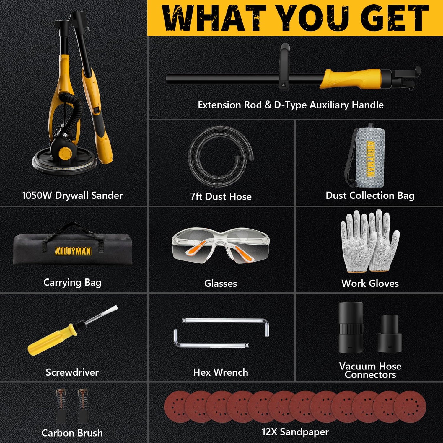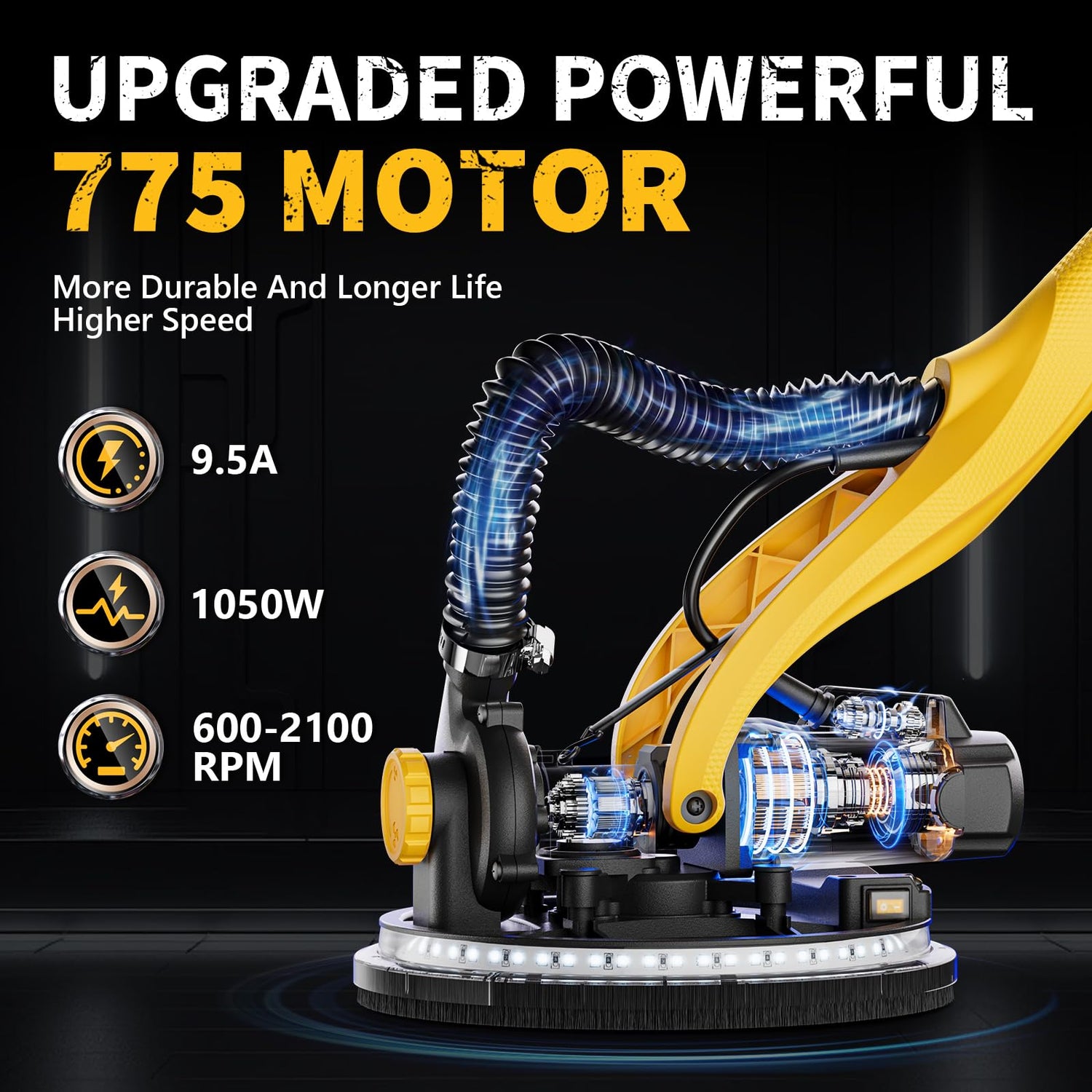 - 【HIGH POWER PURE-COPPER MOTOR】Powered by a 1050W high-performance copper motor, this electric sander delivers strong power and high efficiency, making it durable and long-lasting. Ideal for sanding drywall, ceilings, floors, and more.