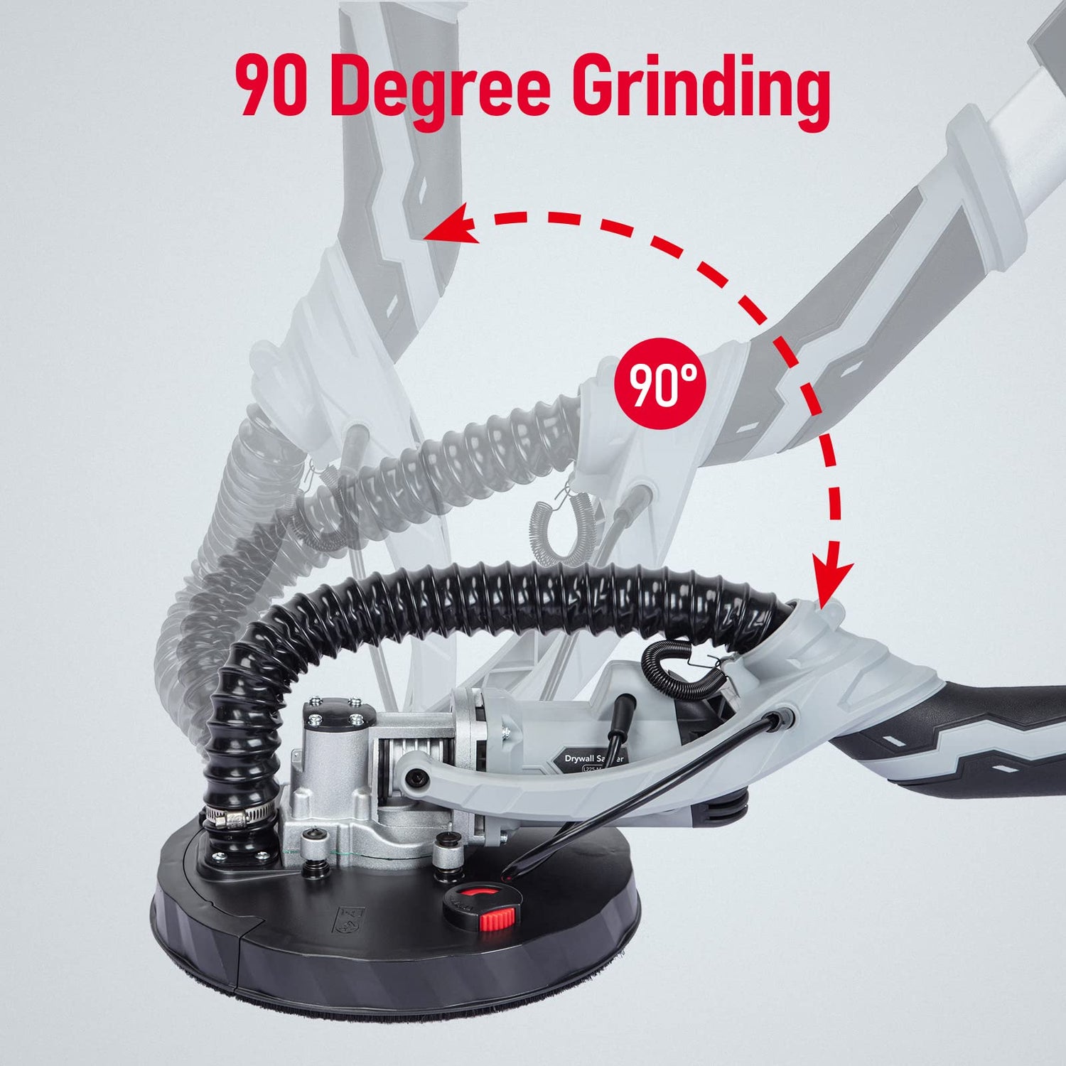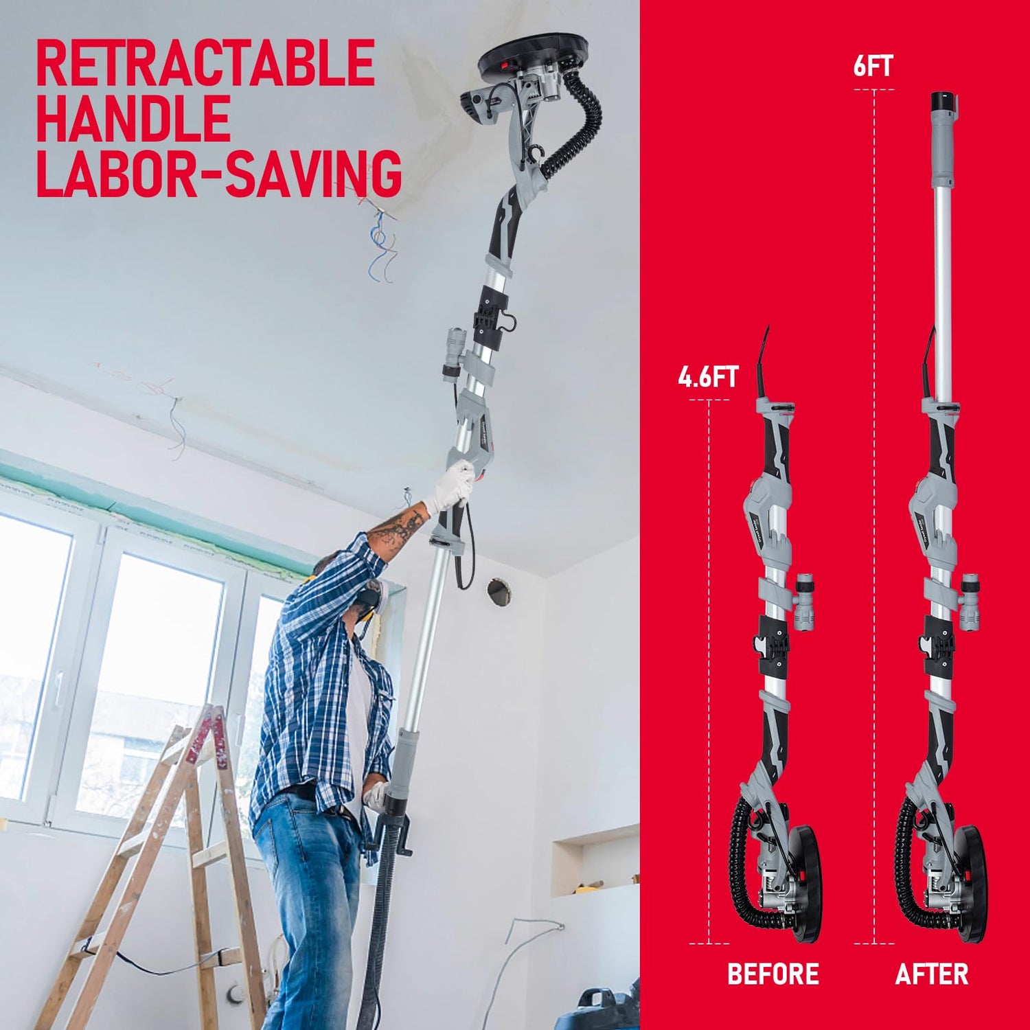 - 90° Pivoting Head & Foldable Handle: Featuring a 90° pivoting head that swivels in all directions, the drywall sander automatically adjusts to be flush against every surface it encounters. The extensible handle can be adjusted in length from 4.6 feet to 6 feet, making it suitable for various height workspaces. Additionally, the foldable design allows for easy storage and transportation.