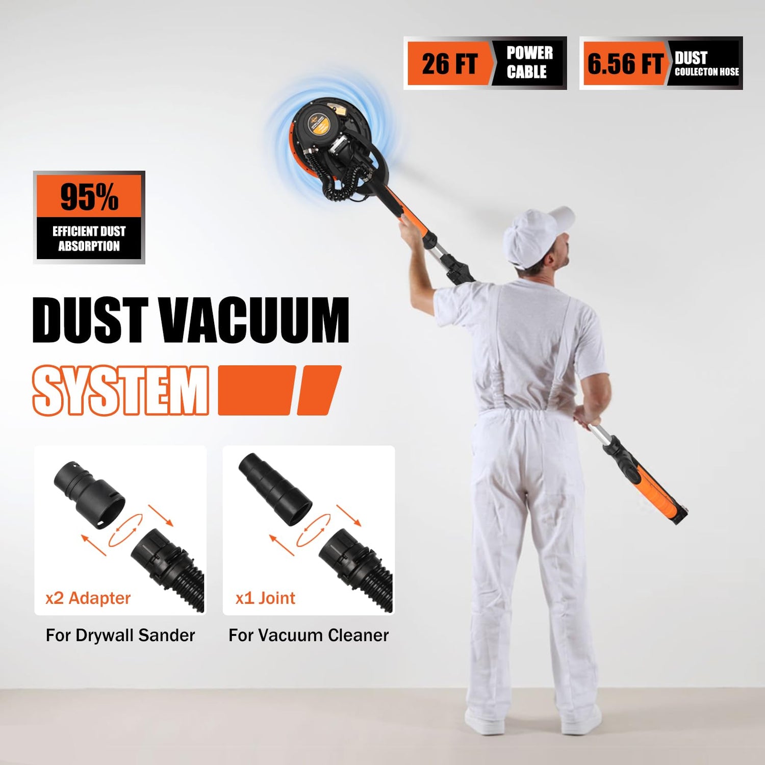 - 【95% AUTOMATIC DUST REMOVAL】Our drywall sander with vacuum features a unique patented design with a dust-proof structure and a powerful adjustable suction system, ensuring that almost all airborne dust is effectively removed. This electric drywall sander also comes with a universal vacuum hose connector that connects to most of household vacuum cleaners and double PBA vacuum tube can vacuum at high speed. Say goodbye to dusty working environments and enjoy a fast and clean sanding experience.