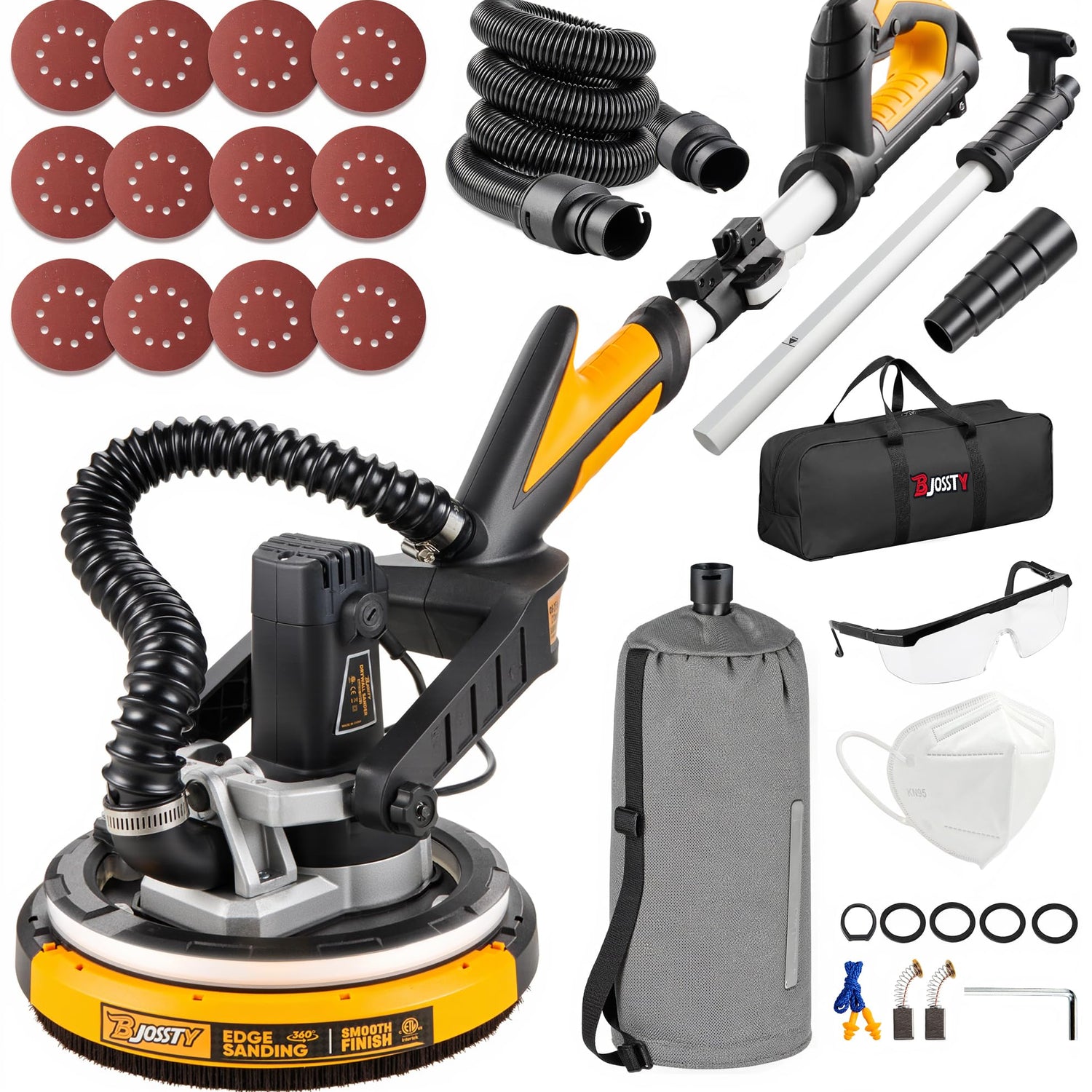 - [Warranty]: We offer 3-year factory warranty. Package list: 1 x drywall sander (26ft power cord), 12x sanding discs(A80/100/120/150/180/240), 1 x set of safety kit(1 x goggle 1 x earplugs, 1 x mask ), 1 x carrying bag, 1 x hook-and-loop fastener, 1 x dust collection bag, 3 x vacuum hose connectors, 1 x dust extracting hose, 1x hex wrench, 2 x carbon brushes, 1x user manual.