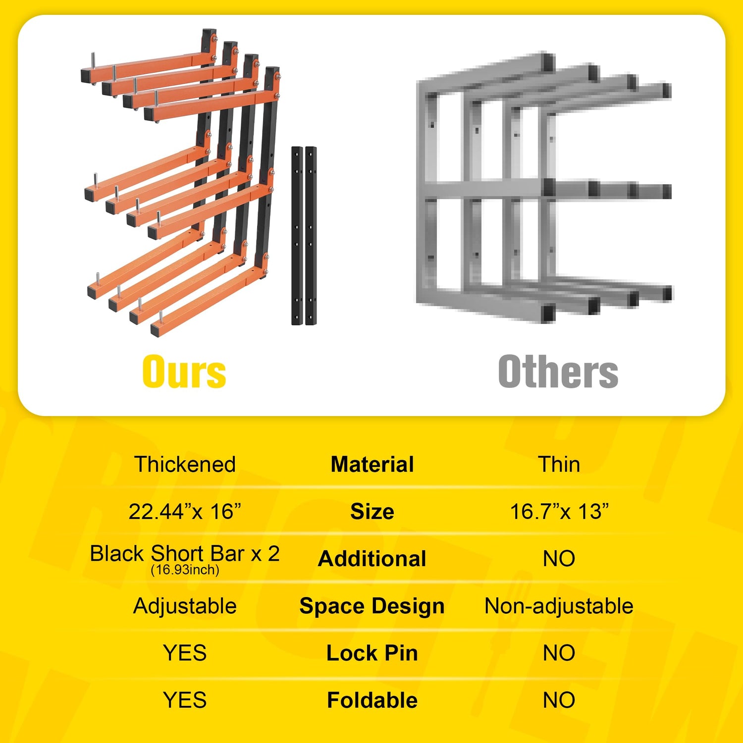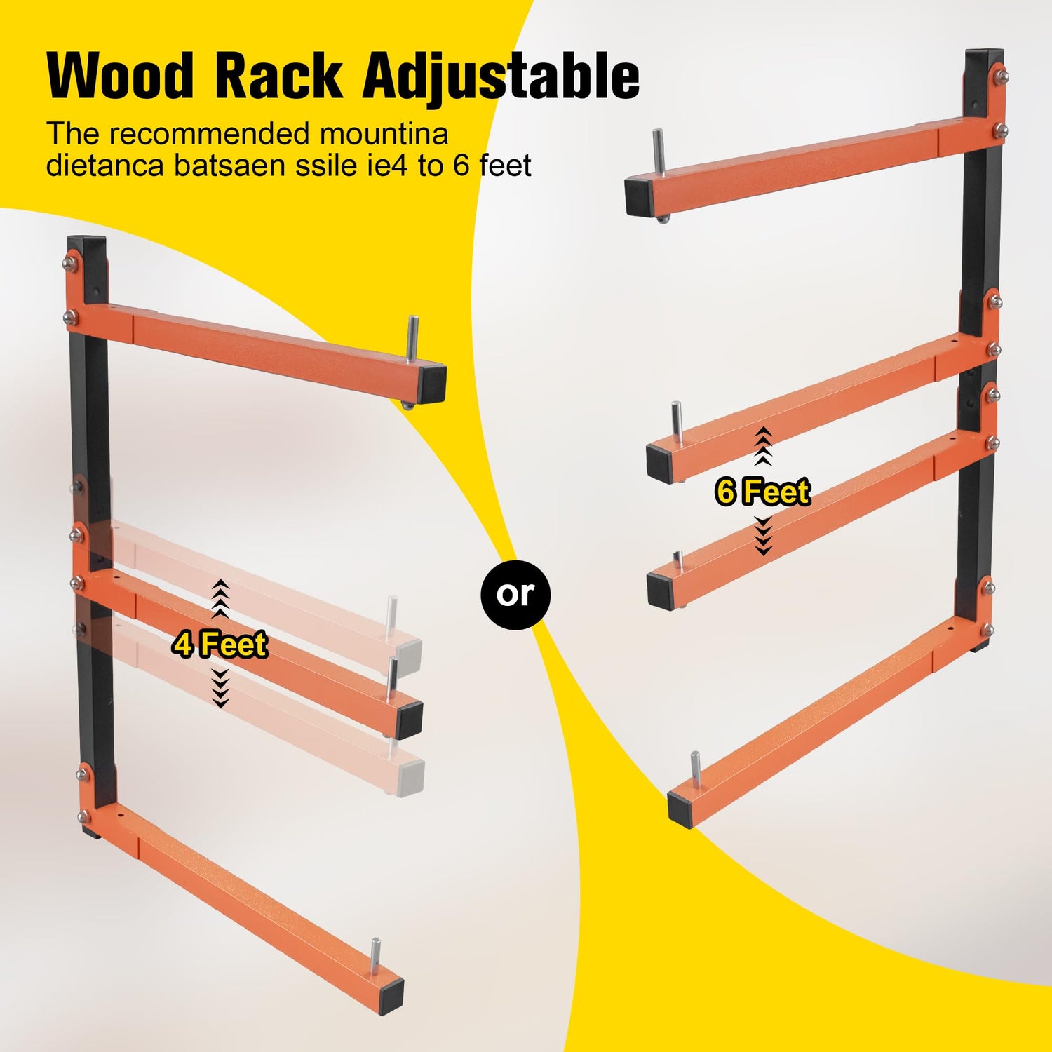 • Longer Lumber Storage Rack: The black poles of the wood storage racks are 22.44 inches long, with orange arms measuring 16 inches. The middle bracket can be adjusted up and down by 4 inches based on storage space requirements. The adjustable storage dimensions for the utility racks are 7 inches and 11 inches respectively. It is recommended to install the guide rails with a spacing between 3.8 to 6 feet, adjustable as needed.