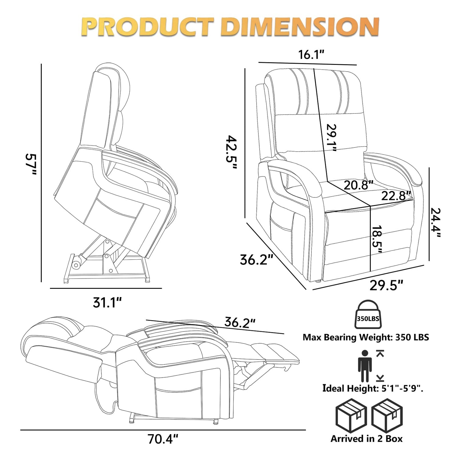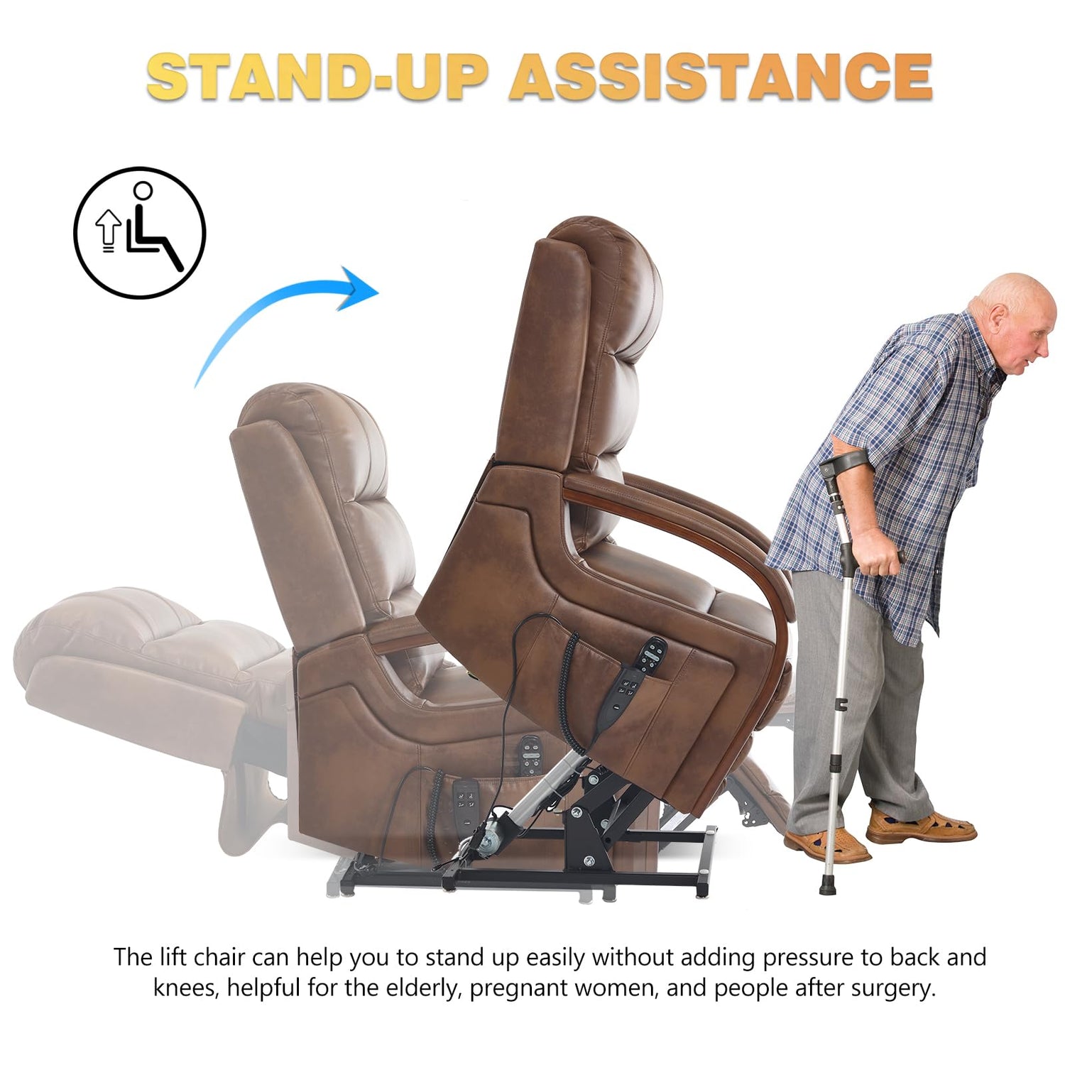 - 【Quality & Comfortable】- The power lift recliner chair features leather durability, elegance, and practicality seamlessly. while its natural elasticity conforms to the body’s contours, providing personalized support that improves with us.It is also easy to clean,spills and stains can be quickly wiped away with a damp cloth.The sturdy hollow wooden armrests give your hip and thighs more space, without cramped feeling. The durable steel base ensure that the chair can hold up to 350 pounds weight and provide long-term use.