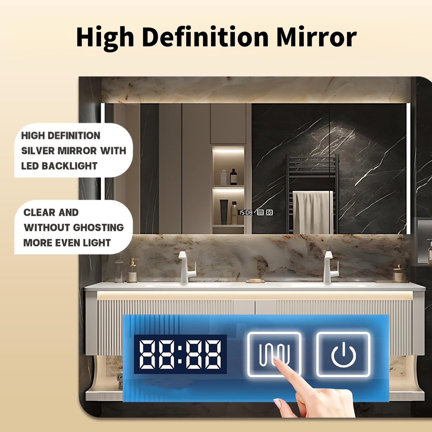- HD SMART MIRROR WITH DEFOGGER: This bathroom vanity showcases an HD LED makeup mirror with advanced defogging technology. A single touch of the demist button ensures a crystal-clear, high-definition reflection in seconds, even after a steamy shower.