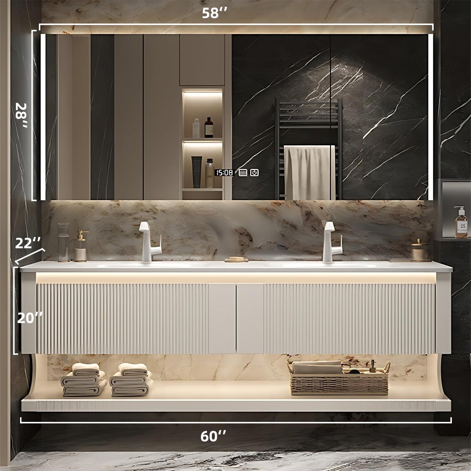 Dual Sink Bathroom Vanity, Modern Bathroom Vanity with Double Sink, 60" Solid Wood Bath Vanity Set Includes Smart LED Mirror Cabinet and Strip Sink Cabinet, Floating Sink Vanities for Home - White
